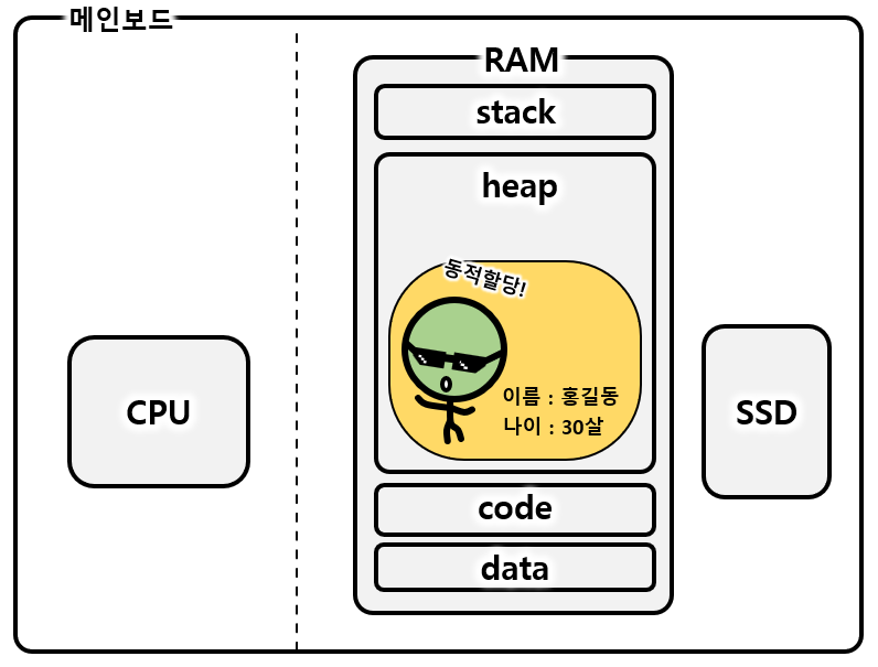 '힙 메모리에서 Person이라는 구조체 크기만큼 나한테 줘봐. 거기에 데이터 좀 넣어두게'