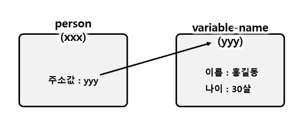 개체에 대해 좀 더 자세히 살펴보자. Java에서 개체를 만들기 위해 클래스를 사용하는 것은 힙메모리를 사용한다. 참조형(포인터형)이라는 말은 Person person = new Person(); 해당 코드에서 person이라는 변수에 메모리 주소가 담겨있다는 말이다. 해당 메모리로 가면 개체가 존재하며, 그 안에 '홍길동', '30살'이라는 데이터가 들어있는 것이다. 같은 곳에 있는 데이터를 가리킬(참조할) 뿐이다.