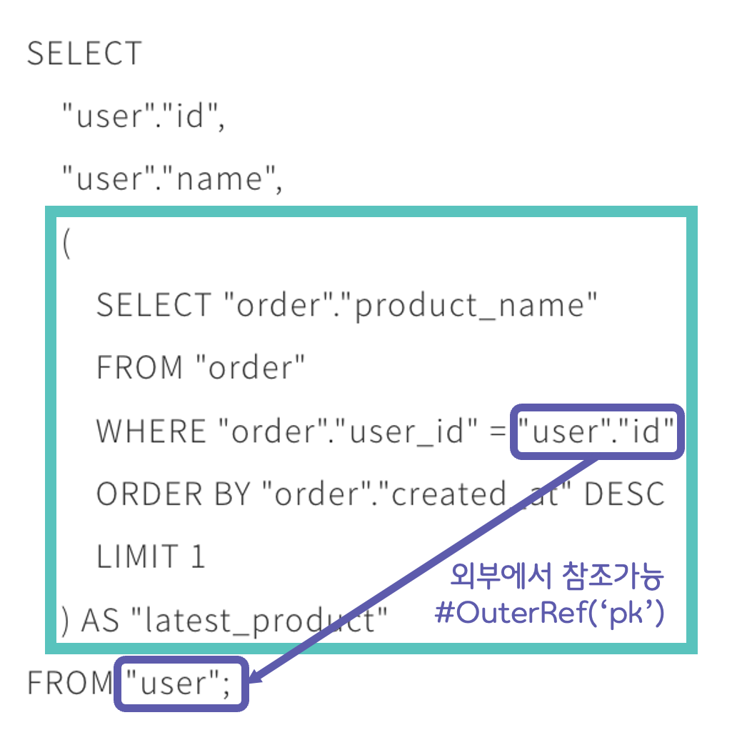 예시) OuterRef('pk') : User 개체의 pk를 내부 쿼리에서 참조