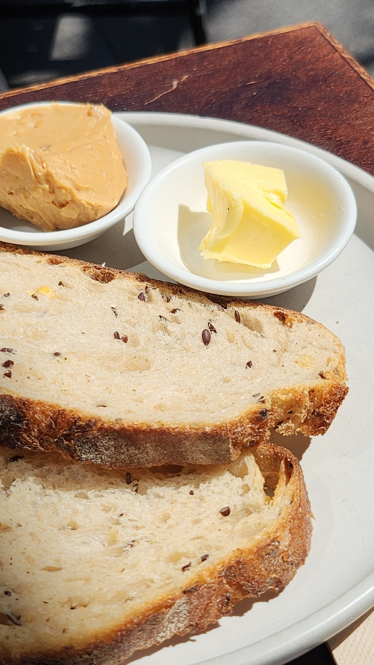 그리고 함께 주문한 Sourdough. 호주엔 가는 곳마다 사워도우가 있다. 아침부터 시큼한 빵을 때려 넣을 테다. 버터와 땅콩 그림을 빵 위에 함께 쓱 발라 한 입 베어 물었다.