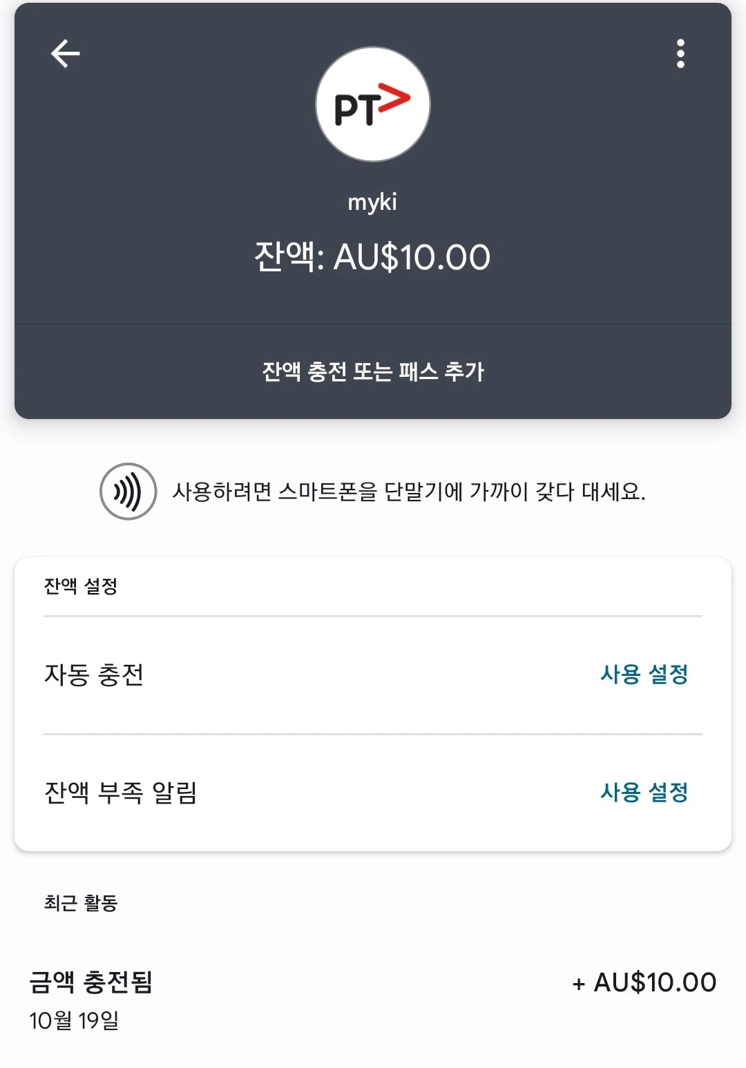 '휴대폰으로도 가능한 방법이 있지 않을까?'라는 '혹시나'의 마음으로 휴대폰 이곳저곳을 터치해 가며 뒤적거려 본다. 역시나! 구글 페이가 가능하다. 호주 10달러를 충전했다.