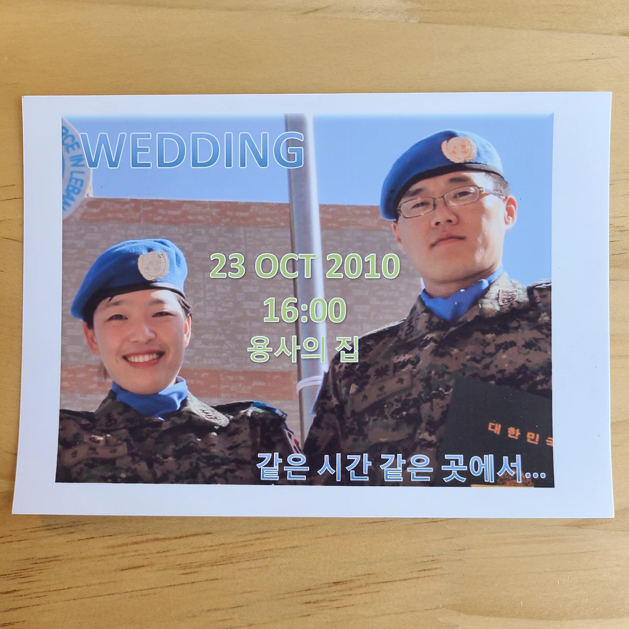 더 큰 문제는 결혼 날짜를 10월 23일로 정해 주셨는데, 귀국이 8월이라 많이 촉박했다. 다행히 현지에서 인터넷 사용은 가능했기 때문에 모든 준비를 인터넷으로 할 수밖에 없었다. 예식장 섭외부터 웨딩촬영 등 세세한 부분까지 사전 계약을 하고 귀국 후 휴가기간 동안 둘만의 여행과 결혼 준비에 매진했다. 그러다 보니 결혼식 시간이 16시 밖에 없었고, 함께 레바논에 있던 사람들에게 손수 만든 청첩장을 줄 수밖에 없었다.