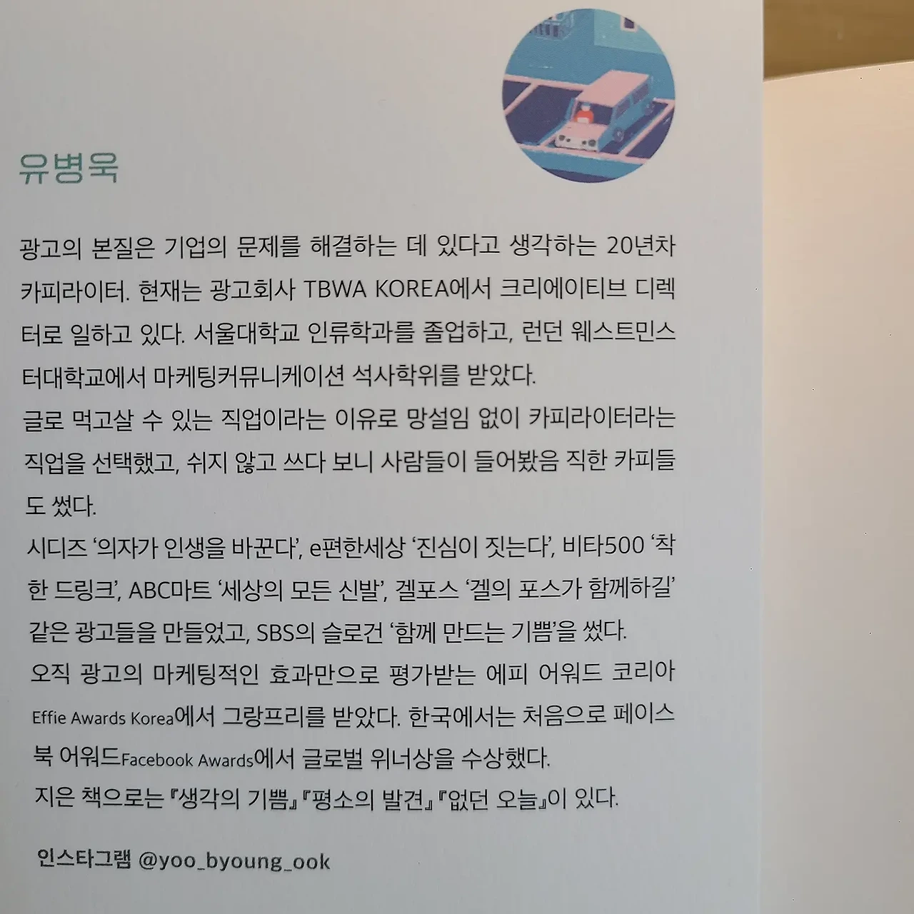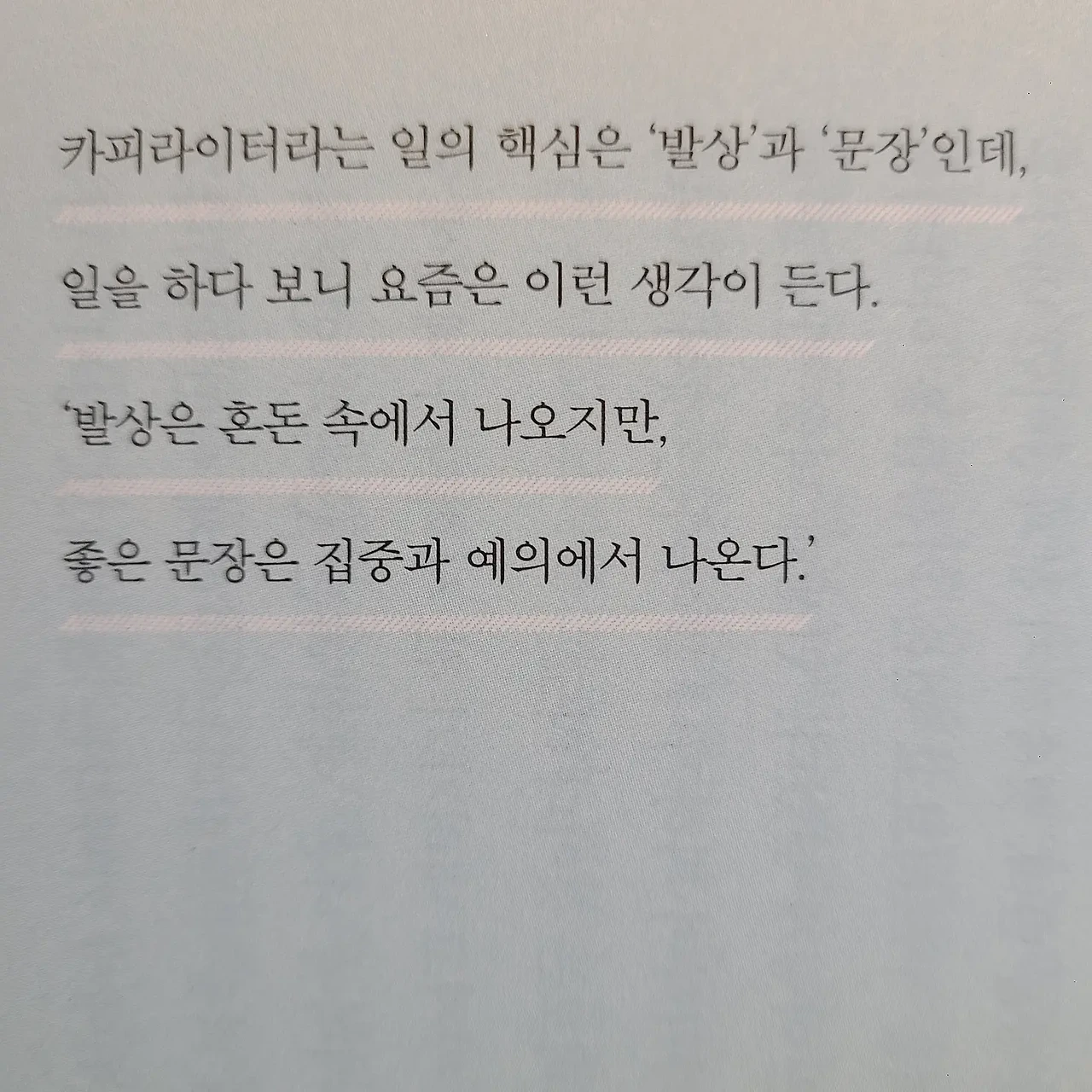 작가의 문체는 개성이 살아있는 데, 부정적인 리뷰를 쓴 사람은 정형된 틀을 좋아했던 것 같다. 아마도 그분은 하루키도 싫어할게 뻔하다. 하여튼, 좋은 글에 대한 감사의 뜻으로 작가 인스타 계정에 댓글을 남겼더니, 네 음절 단문 답이 왔다. 순간 불끈했지만 다시 생각했다. 글 모임에서 다른 작가가 댓글을 달아도 답글을 바로 못써서 좋아요만 눌러 놓는 시답지 않은 작가 놀이를 하고 있는 나를 돌아봤다. 유명 카피라이터이자 작가가 댓글에 좋아요만 눌러도 황송해야 하는데, 댓글까지 읽고 최고 수준의 발상을 통해 예의를 갖춰줬음에도 내가 멍청했다. 덕분에 책에서 느낀 감정을 일상에서도 느꼈다.