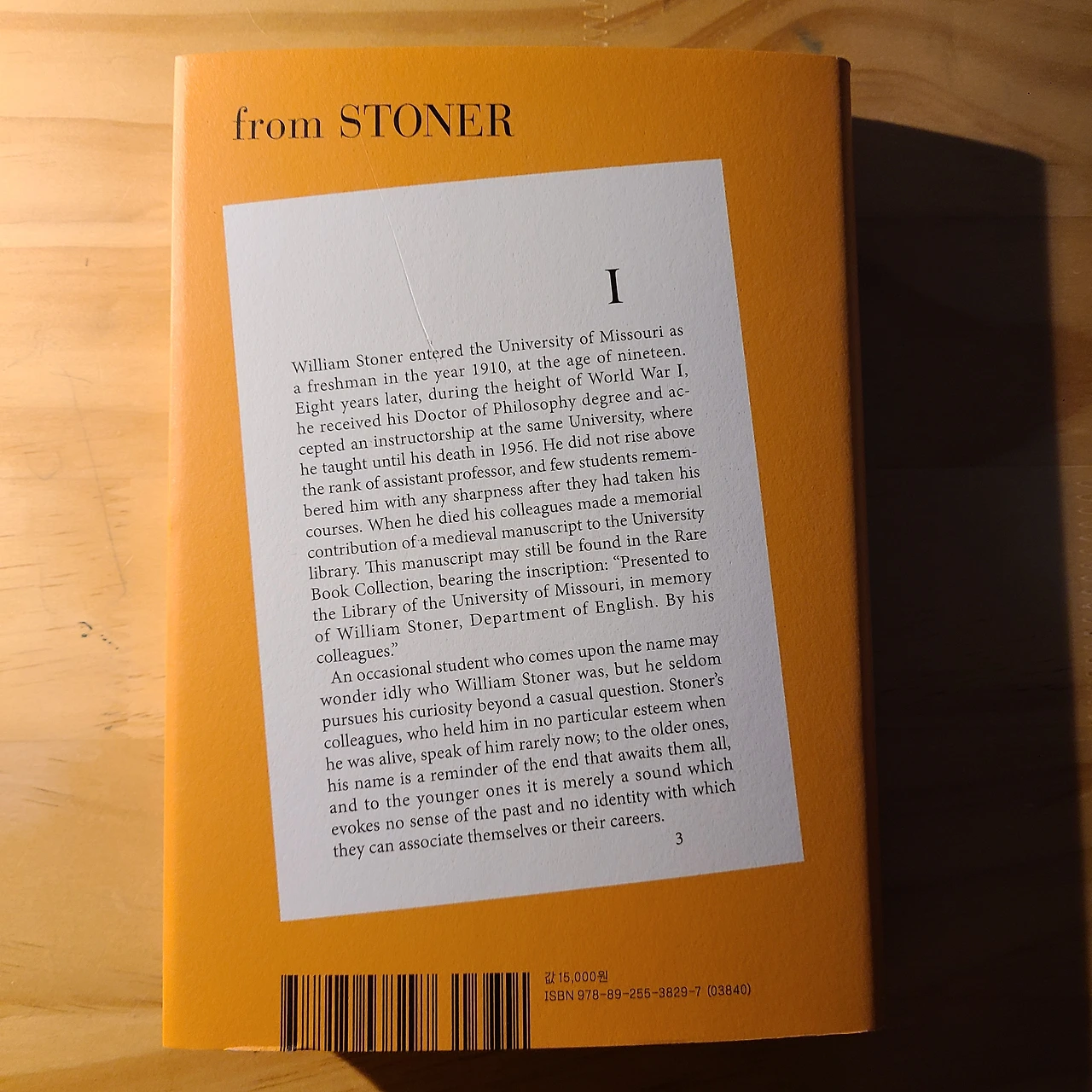 다른 책과 동시에 읽다 보니 중간에 집중 못한 부분도 있지만, 정해진 시간까지 읽어야겠다는 생각으로 숙제처럼 완독했다. 책을 많이 읽지 않은 사람에게 흥미로운 사건과 사고가 없는 이야기는 주목을 끌지 못했기 때문에 완독이 쉽지 않았다. 전체 17장으로 되어 있는데, 5장까지는 상당히 지루하게 읽었다. 어느 순간부터인지 모르겠지만 단단함이 스며들면서 묵직하게 올라오는 감정을 느꼈고, 조금씩 책으로 끌려갔다. 깊이 집중했을 때는 스토너가 절망에 빠지는 순간을 함께 느끼기도 했다. 소설을 함께 읽는 사람들은 술술 읽혀서 일찍 완독 했다는 말이 들렸지만 나는 한 장 한 장이 쉽게 넘어가진 않았다.