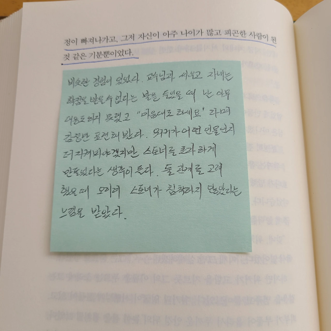 : 과거를 회상하는 장면이 인상적이다. 큰 사건이 발생하지 않았고 반전을 가져오는 문장도 없었는데, 잔잔하게 묵직한 무언가가 내게 다가왔다. 비슷한 상황을 경험하는 스토너에게 생긴 감정을 구체적으로 묘사하지 않았지만, 스토너가 느껴졌다. 크게 집중하지 못한 상태에서 읽었는데, 독자로 하여금 그런 느낌을 받게 한다는 건 소설 무게감이 대단한 것 같다.