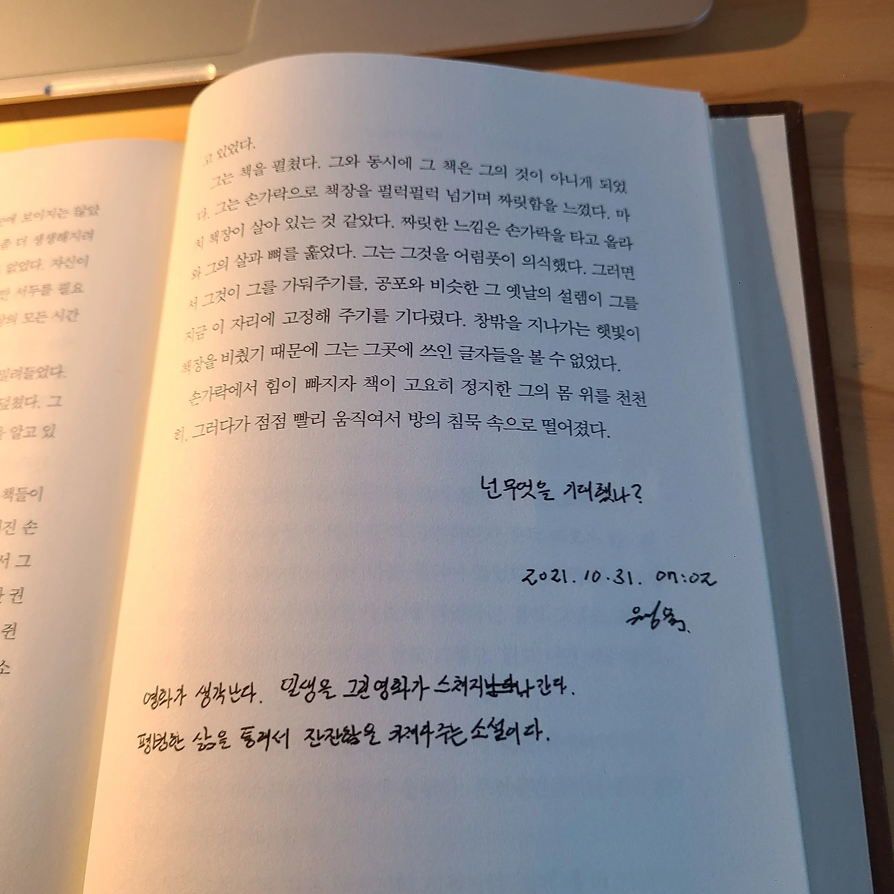 : 내용적인 부분보다. 문장이 마음에 들었다. 현실을 기술하고 그 현실을 통해서 과거로부터 이어오는 새로운 부분을 전해주면서 독자에게 생각할 시간을 주는 문장이 마음에 들었다.