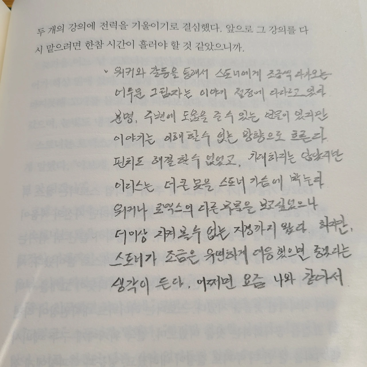 : 워커와 갈등으로 스토너에게 조금씩 다가오는 어두운 그림자는 이야기를 절정으로 끌고 간다. 분명, 주변에 도움을 줄 수 있는 인물이 있지만 이해할 수 없는 방향으로 흐른다. 핀치도 해결할 수 없었고, 기대하지는 않았지만 이디스는 더 큰 못을 스토너 가슴에 박으면서 죽음에 이르는 고통을 만들어 낸다. 워커나 로맥스의 다른 부분을 보고 싶었으나 더 이상 지켜볼 수 없는 지경까지 왔다. 하지만, 스토너가 조금은 유연하게 대응했으면 좋겠다는 생각도 든다. 어쩌면 요즘 내 모습과 비슷해서.