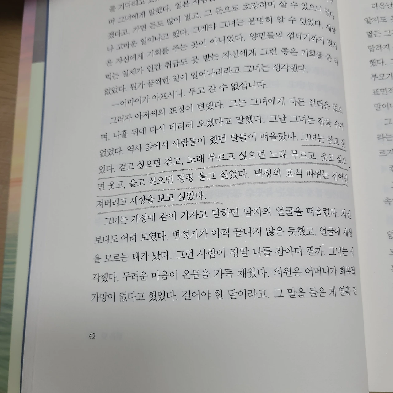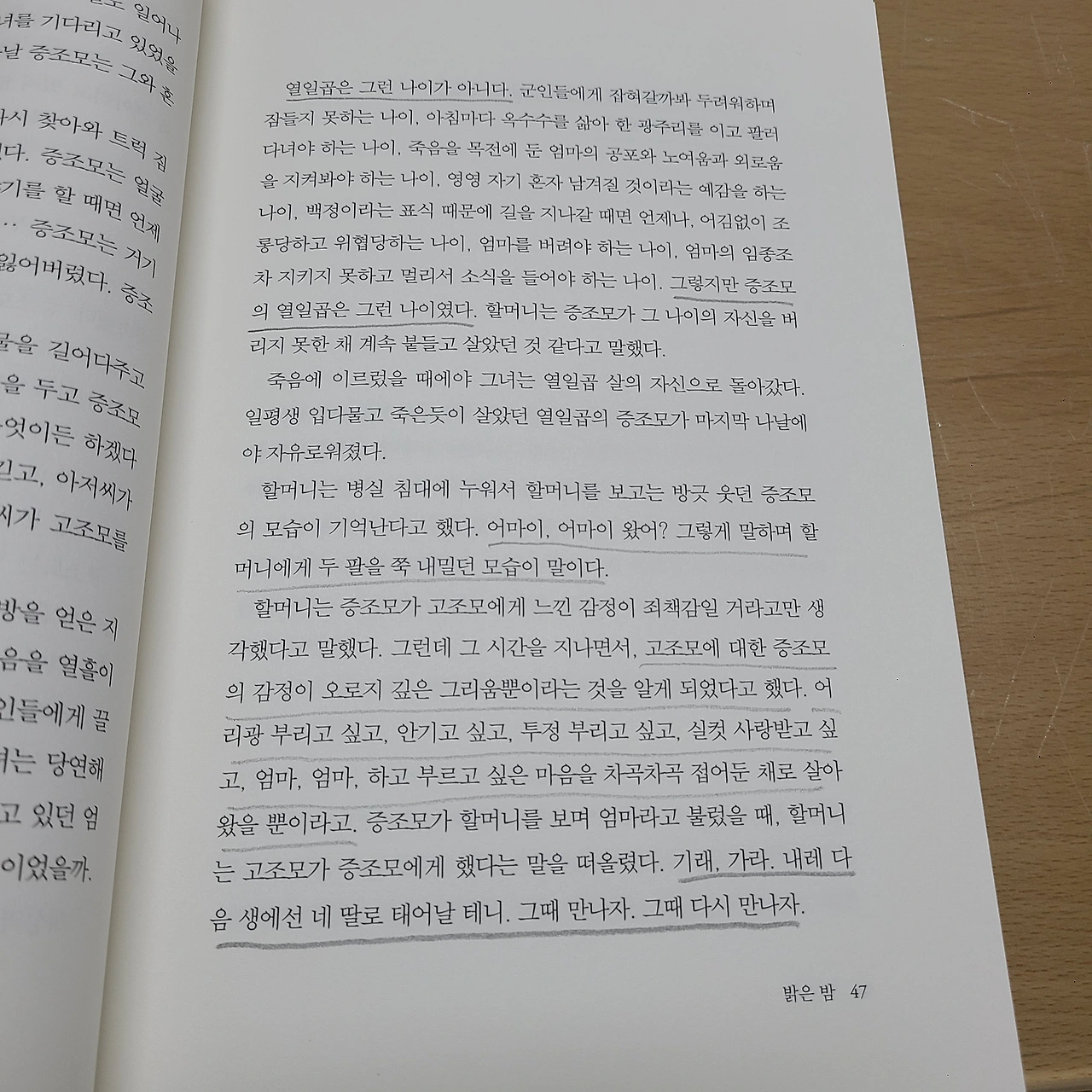 열일곱은 그런 나이가 아니다. 군인들에게 잡혀갈까 봐 두려워하며 잠들지 못하는 나이, 아침마다 옥수수를 삶아 한 광주리를 이고 팔러 다녀야 하는 나이, 죽음을 목전에 둔 엄마의 공포와 노여움과 외로움을 지켜봐야 하는 나이, 영영 자기 혼자 남겨질 것이라는 예감을 하는 나이, 백정이라는 표식 때문에 길을 지나갈 때면 언제나, 어김없이 조롱당하고 위협당하는 나이, 엄마를 버려야 하는 나이, 그렇지만 증조모의 열일곱은 그런 나이였다. (중략) 기래. 가라. 내레 다음 생에선 네 딸로 태어날 테니. 그때 만나자. 그때 다시 만나자. "얘야... 우린 그렇게 다시 만났던 거야" 할머니가 내게 말했다.