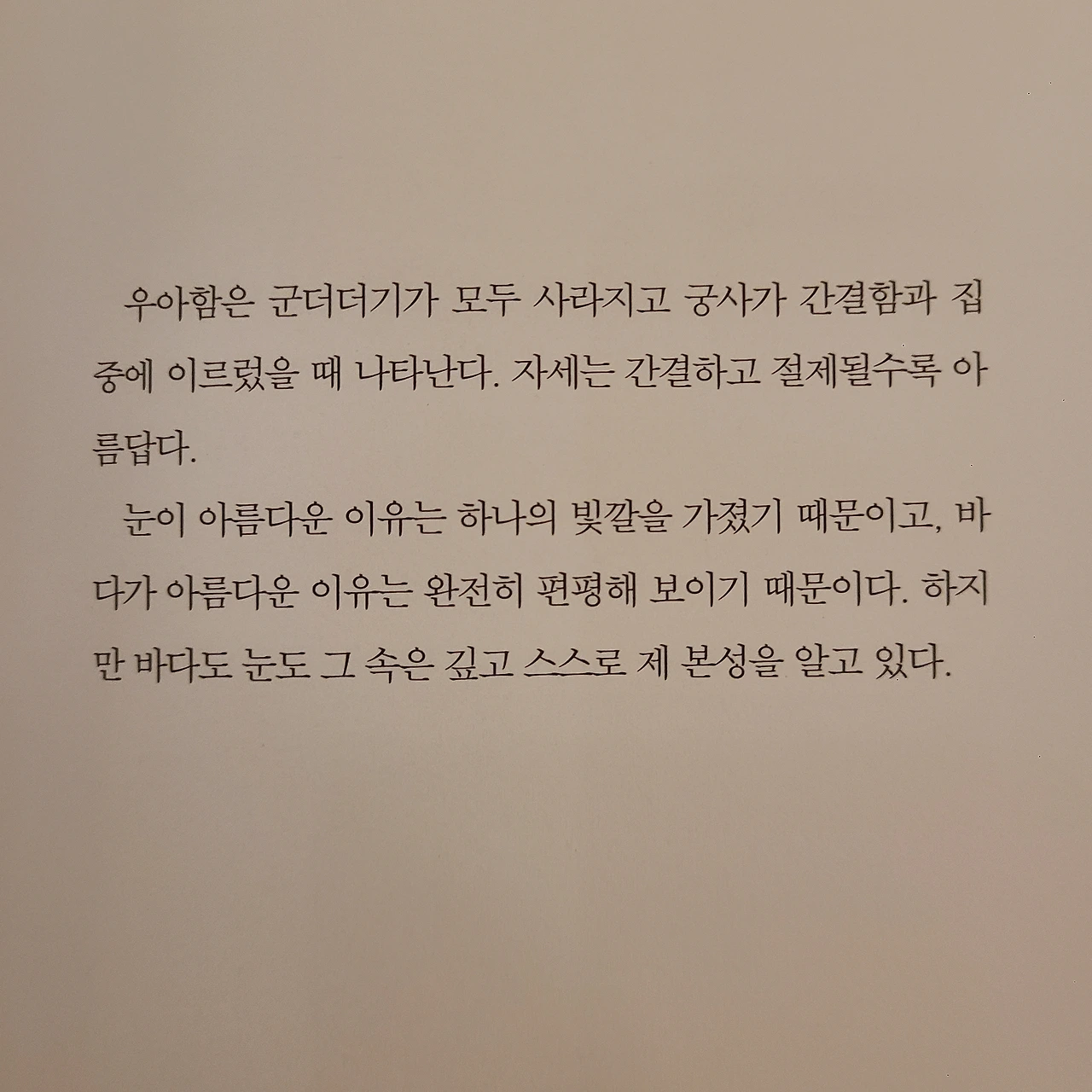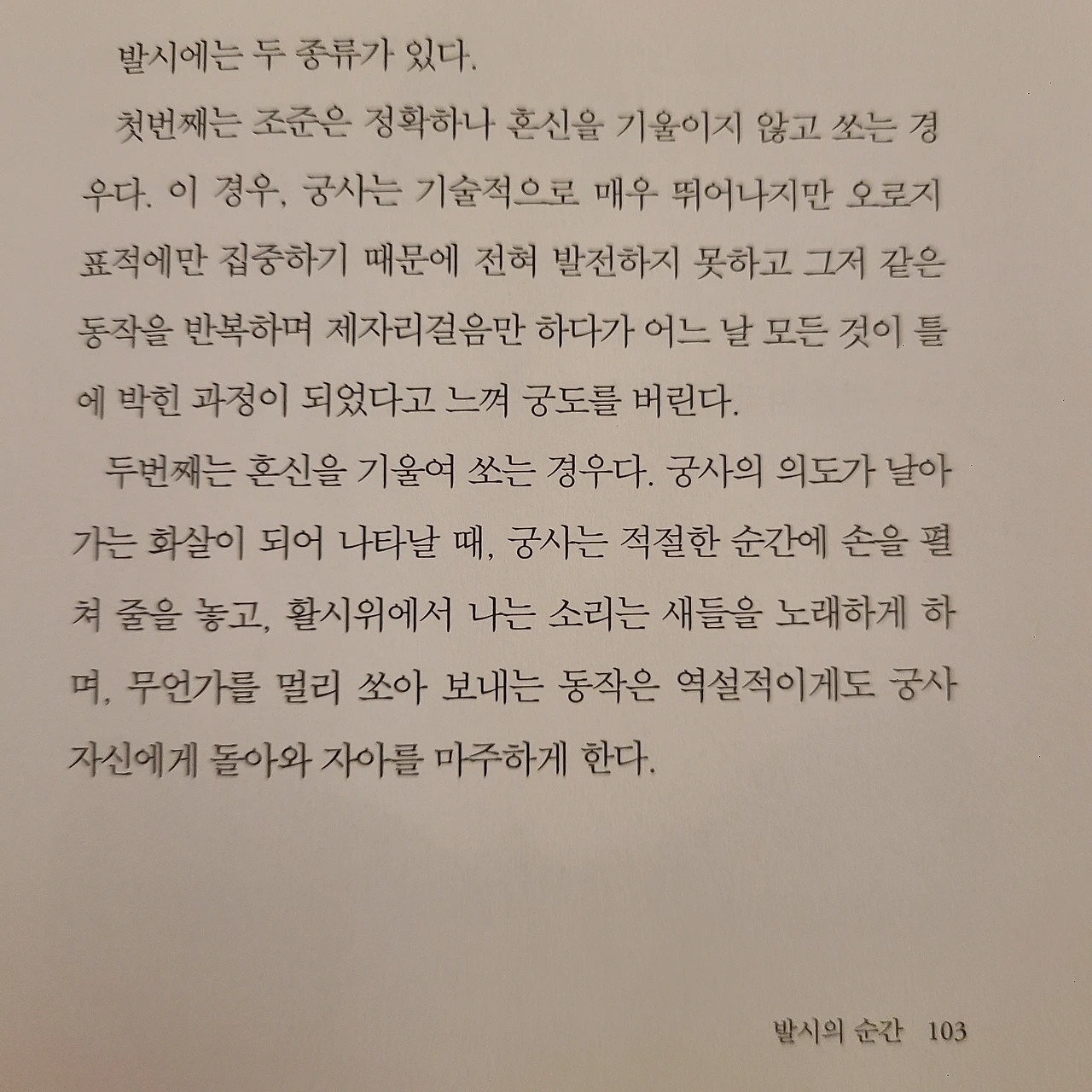 느리게 읽기로 소문난 내가 한 권을 다 읽는데 한 시간도 걸리지 않는다. 책은 프롤로그부터 이야기가 전개된다. 이어서 저자는 한때 궁술로 세상을 평정했던 진이라는 목공의 목소리를 빌려 함께하는 소년에게 궁술에 대한 이야기를 들려준다. 활과 화살이 무엇이며, 화살을 발시하고 목표를 주시하는 것까지 철저하게 표현을 절제하며 담백하게 건네준다. 궁술만 말하지만 마치 사부가 제자에게 삶의 진리를 가르치는 느낌이다. 영감과 직관 그리고 자아까지 복잡하게 생각했던 단어가 궁술을 통해 다가온다. 다 읽고 난 후에 삶의 정수가 내 머릿속에 새겨졌다. 당장 할 일이 떠올랐고 인터넷으로 연금술사를 주문했다.