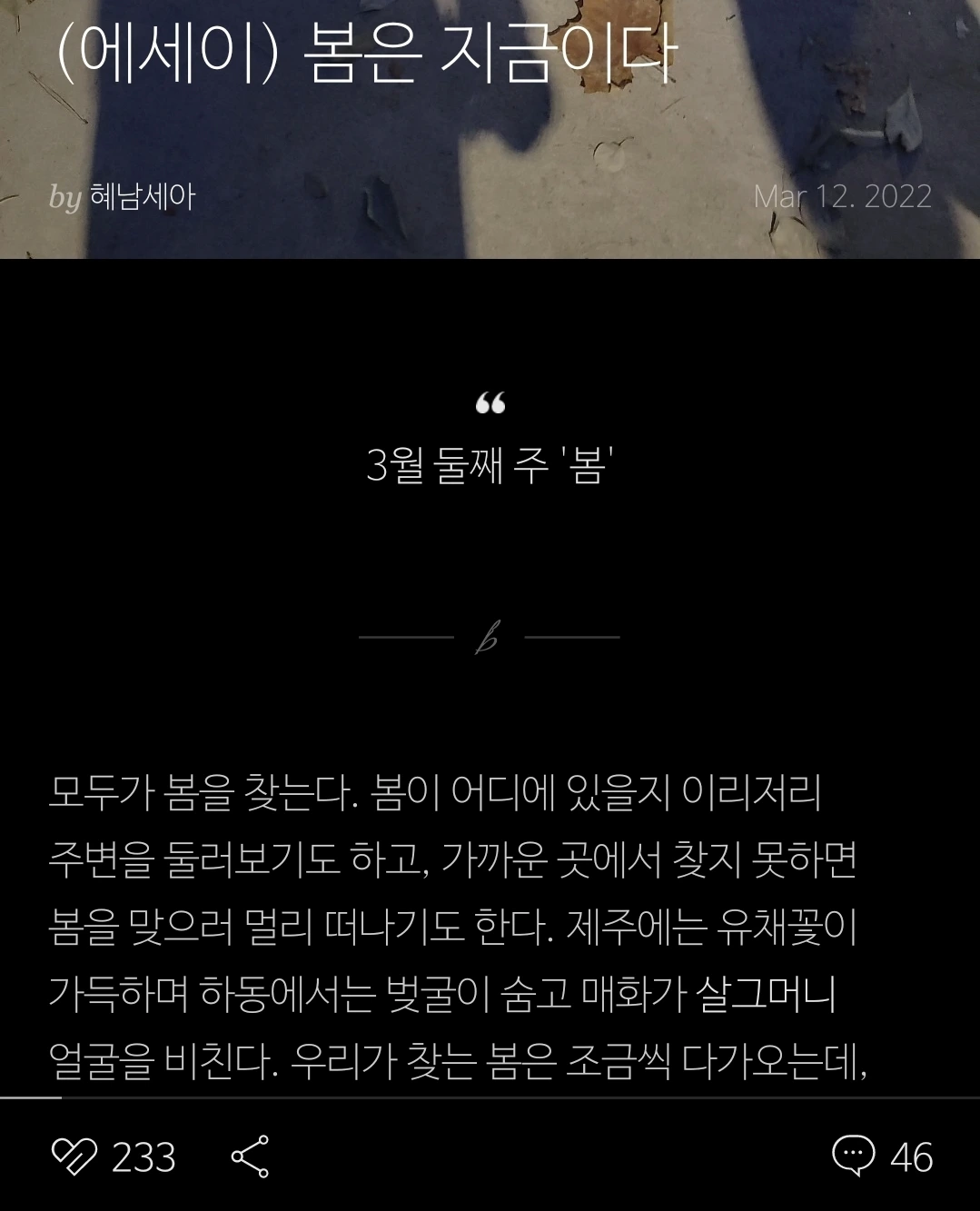 정성을 다해 쓴 글에 댓글이 달리면 기분이 좋다. 대부분 마찬가지일 것이다. 답글을 달면서 소통을 하게 되고 글을 나누는 작가들과 한걸음 더 가까워지는 계기가 된다. 가끔은 댓글을 통해서 크게 배우기도 한다. 나 역시 댓글을 좋아하며, 가끔 장문을 받을 때는 가슴이 두근거리기도 한다.