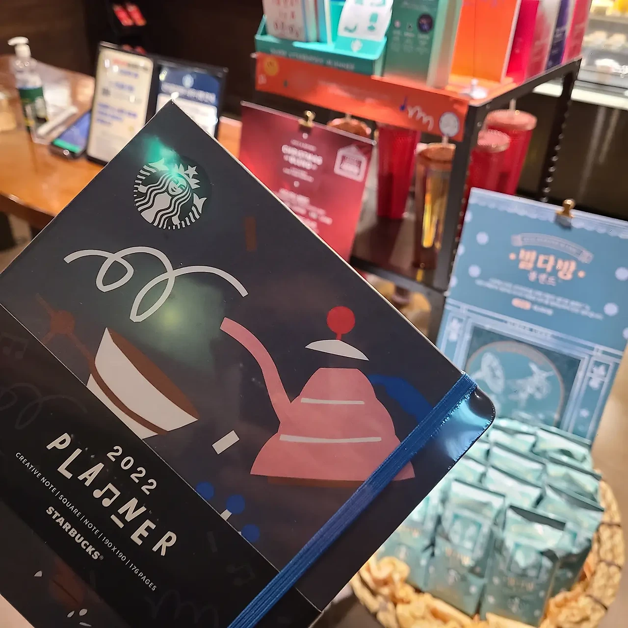 성큼성큼 카운터 앞으로 갔는데, 바로 앞에 사이렌 왕국 노예 한 명이 데스크 모듈 그린색을 하사 받으며, 조공으로 음료 하나와 식품 두 개를 다시 구입했다. 처절한 노예를 보고 불쌍해하며 잠시 기다리다가 주변을 살피는데 시선이 머무는 적당한 곳에 2023 스벅 다이어리로 가장한 IED(급조 폭발물)를 발견했다. 하마터면 손을 내밀어 열어 볼 뻔했다. 생각만 해도 끔찍하다. 다이어리를 열었다면 순간 뇌는 멈추고 심장은 폭발하면서 에스프레소 14잔은 별도 컵에 담고 스페셜 음료 3잔은 캐리어에 끼워서 집으로 털레털레 가져가는 패잔병이 되었을 것이다.