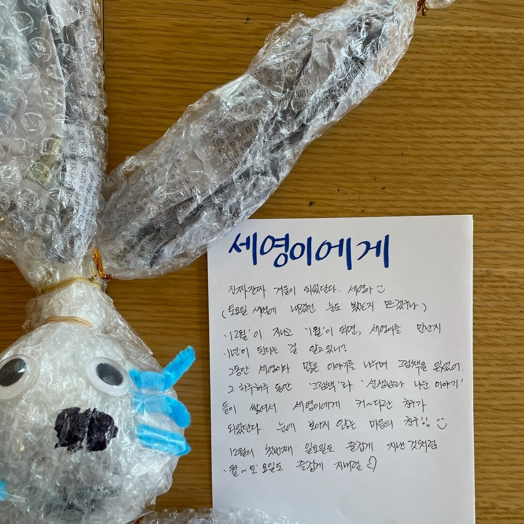 다짐을 실천하려고 책상에 앉았다. 오늘 수업 때 읽고 가져온 코끼리 코가 그려진 듯한 '커다란 비밀 친구'를 펼쳤다. 편안한 그림 사이로 슬퍼 보이는 아이 한 명이 나타났다. 큰 딸 말처럼 슬프겠다는 느낌이 몰려왔다. 다만, 지면 두 장에 단 두세 문장 정도만 쓰인 책장을 넘기면서 책값을 쪽수로 나눴을 때 비용이 얼마일까라고생각하는 순간 편안한 나뭇잎 그림 사이에 쓰인 짧은 두 문장이 내 시선과 머릿속 계산을 멈춰 버렸다.