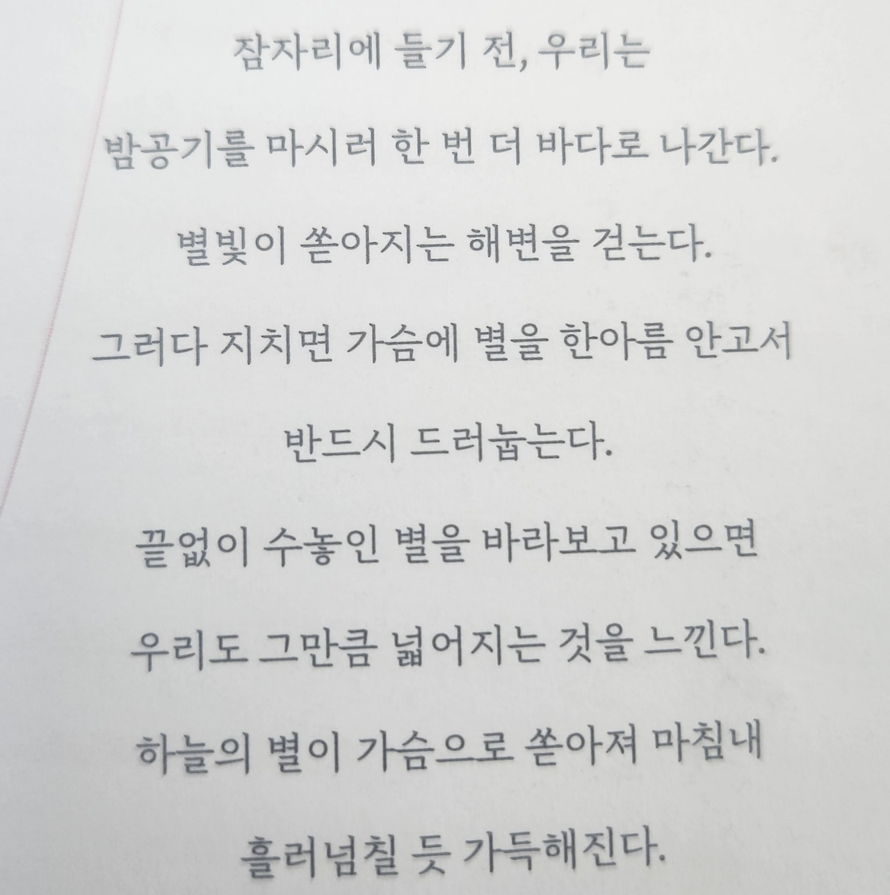 백오십 쪽 정도로 짧은 에세이라서 두어 시간 만에 다 읽었다. 섬세한 감성이 전달되었고 많은 단상을 가져다주었다. 무엇보다도 좋았던 점은 책 구성과 흐름이었다. 조개껍데기를 하나씩 이어가면서 작가 생각과 삶의 해결책을 건네주었고 나에게 잘 닿았다. 버림과 여백 그리고 지금과 여기에 대한 중요성도 깨달았다.