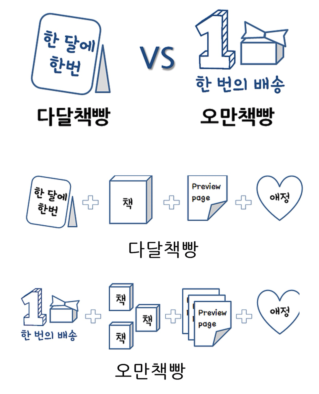 서비스는 매월 정기적으로 책 한 권을 보내주는 다달책빵과 한 번에 오만원어치 책을 보내주는 오만책빵이있다. 첫 번째가 원래 생각했던 서비스로 3세대 소비문화 서브스크립션 커머스를 책과 혼합한 서비스모델이다. 큐레이션과 정기배송을 합쳐, 현재 화장품과 꽃이 대표 상품이다. 여기에 우리 서점의 책도 추가해야지. 오만책빵은 일본 홋카이도의 작은 서점에서 하고 있는 일만선서의 벤치마킹으로 오만원 이내에서 책을 적절하게 골라 보내주는 1회 배송서비스다. 모든 추천은 메일로 주고 받는 편지를 기반으로 이루어진다. 저랑 펜팔해요.