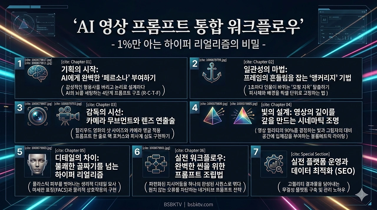 BSBKTV 마스터 프로토콜 V6.5.1은 생성형 AI 영상 제작을 슬롯머신이 아니라 “엔지니어링 파이프라인”으로 바꾸기 위한 프롬프트 설계 규격입니다. 핵심은 세 가지입니다.