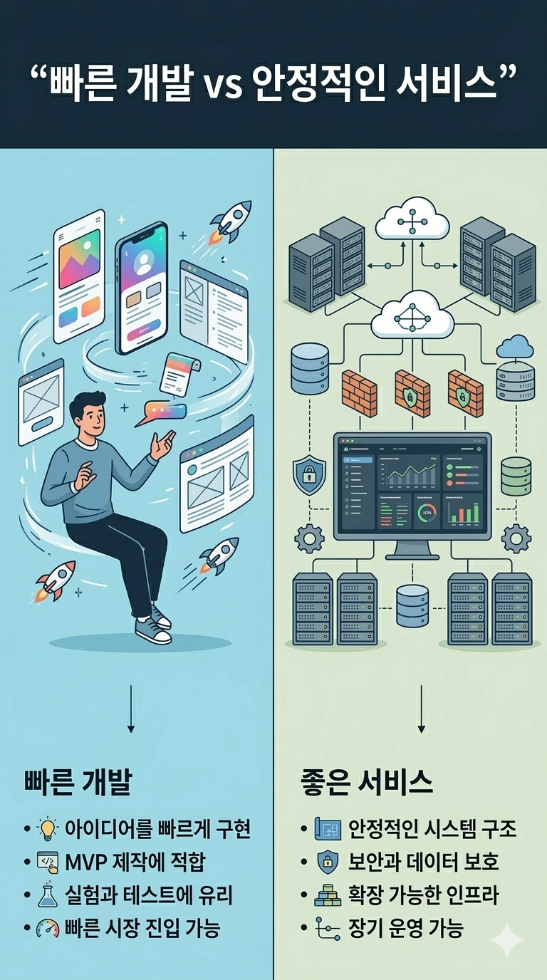 빠르게 만드는 개발과 안정적인 서비스를 만드는 개발의 차이를 설명한 인포그래픽. MVP 제작과 실험에 강한 빠른 개발 방식과 보안, 인프라, 장기 운영을 고려한 서비스 개발의 차이