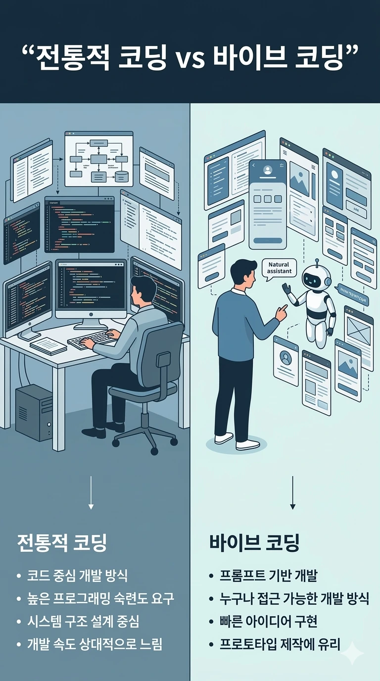 전통적인 코딩 방식과 바이브 코딩의 차이를 비교한 인포그래픽. 코드 중심 개발과 프롬프트 기반 개발의 구조적 차이, 기술 진입 장벽, 개발 속도 등을 한눈에 보여준다.