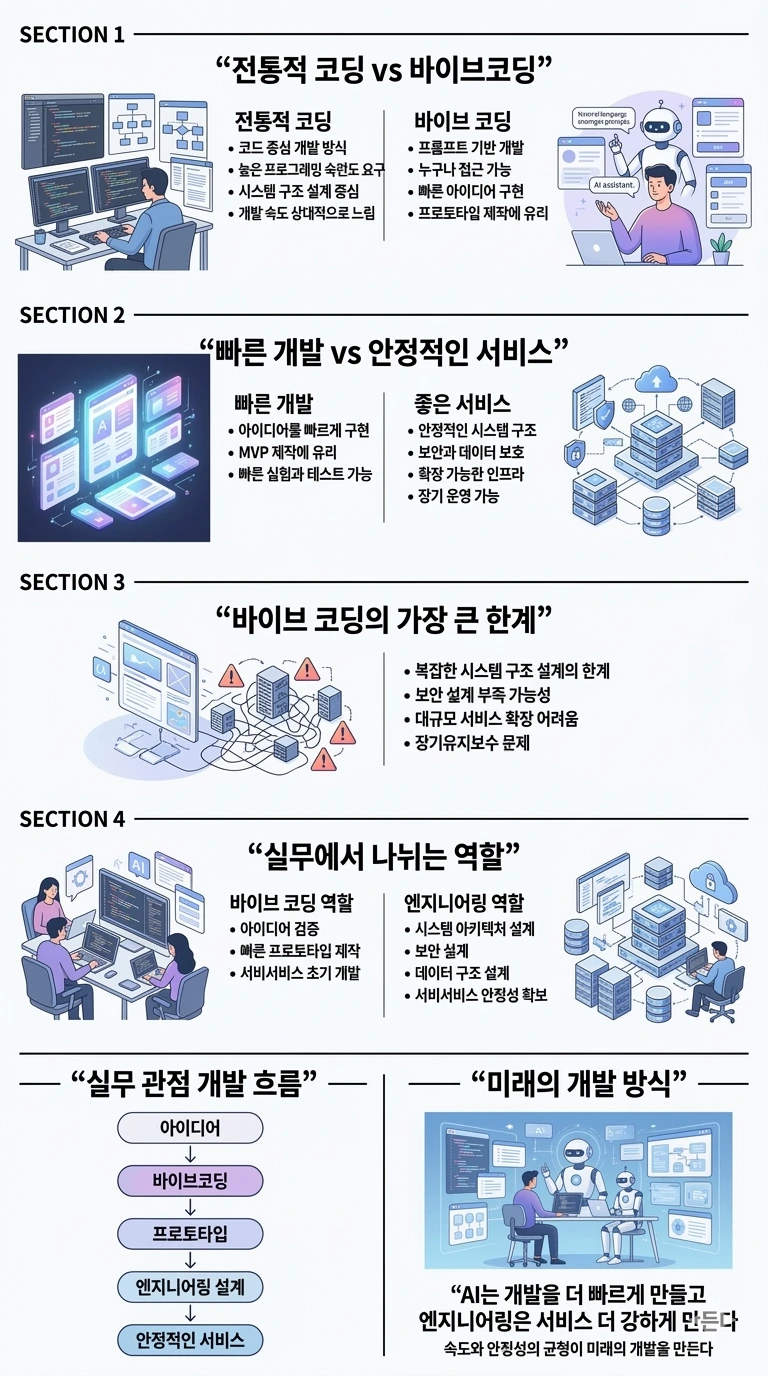 바이브 코딩과 전통적인 소프트웨어 엔지니어링의 차이, 빠른 개발과 안정적인 서비스의 관계, 그리고 실제 개발 현장에서 두 방식이 어떻게 함께 사용되는지를 한눈에 정리한 통합