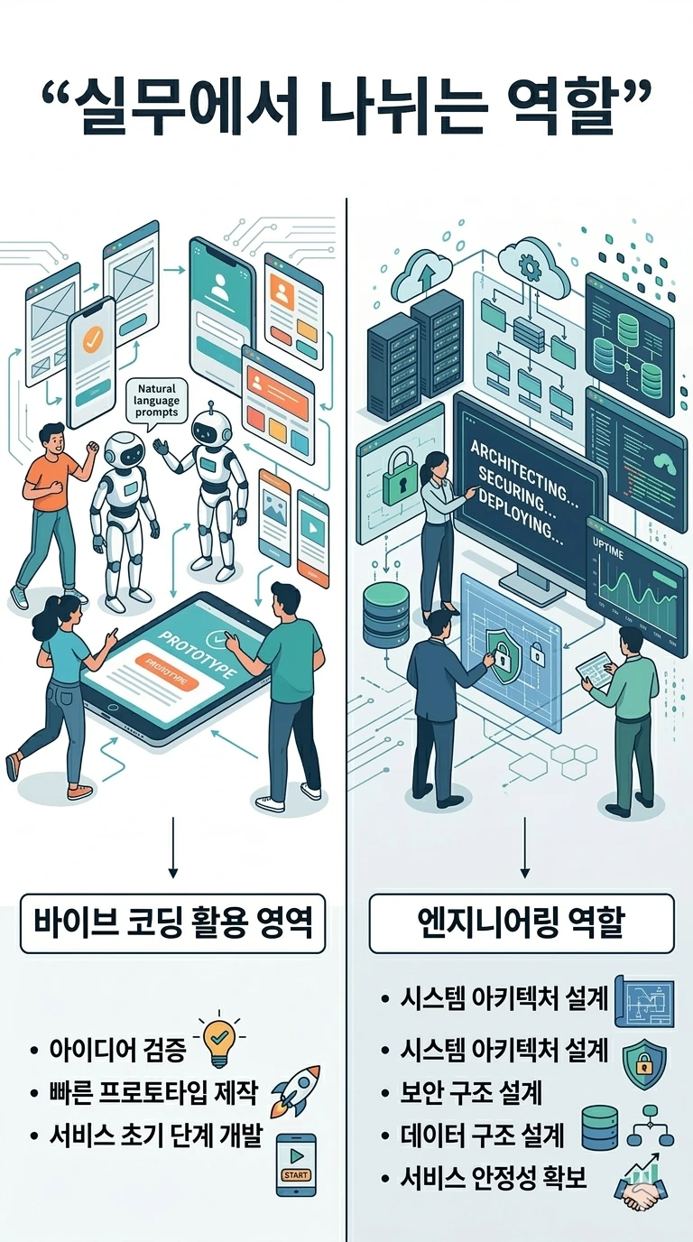 현실의 개발 환경에서 바이브 코딩과 엔지니어링이 어떻게 역할을 나누는지를 설명한 인포그래픽. 빠른 프로토타입 제작과 아이디어 검증 단계, 그리고 시스템 설계와 안정성 확보 단계의
