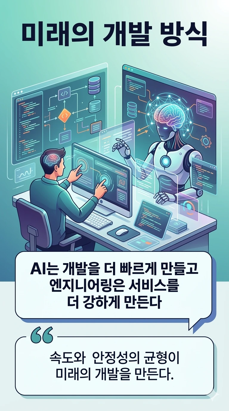 AI와 인간 개발자가 협력하는 미래 개발 환경을 표현한 인포그래픽. AI는 개발 속도를 높이고 엔지니어링은 서비스의 안정성을 강화한다는 메시지를 전달한다.