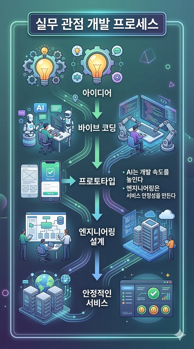 아이디어에서 실제 서비스까지 이어지는 개발 흐름을 정리한 인포그래픽. 바이브 코딩을 활용한 프로토타입 제작 이후 엔지니어링 설계를 통해 안정적인 서비스로 발전하는 과정 설명