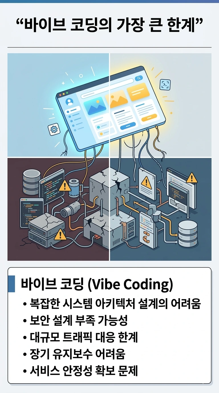바이브 코딩이 실제 서비스 환경에서 마주하는 한계를 설명한 인포그래픽. 복잡한 시스템 구조 설계, 보안 설계, 확장성 문제 등 대규모 서비스에서 발생할 수 있는 구조적 문제를 시각