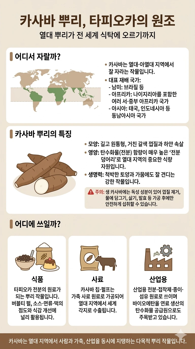 한국에서 가장 익숙한 카사바의 얼굴은 버블티 타피오카 펄입니다. 카사바 전분으로 만든 이 펄이, 밀크티·버블티 속에서 우리가 씹는 말랑한 동그란 알맹이의 정체입니다.