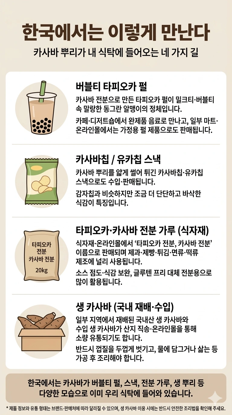 최근에는 충북 등에서 재배된 국내산 생 카사바가 산지 직송 형태로 판매되는 사례도 등장했습니다. “국내산 생 카사바”와 “수입 생 카사바”가 온라인몰에서 소량 유통되고 있고, 상품 페이지에는 껍질 제거·삶기 등 안전 조리법 안내가 붙어 있습니다.