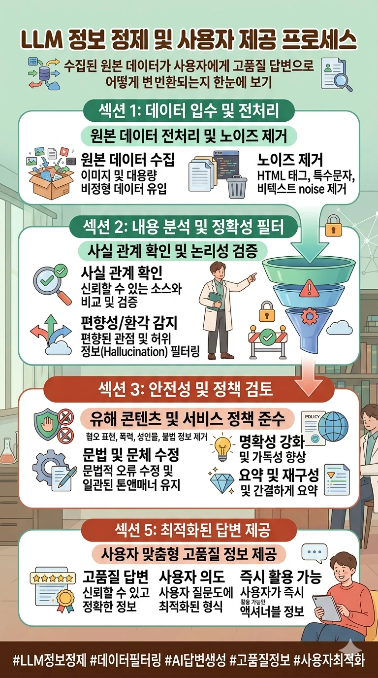 이렇게 수집된 데이터조차 맹신해선 안 된다. 노이즈를 제거하고 사실 관계를 확인하며, 환각과 편향성을 걸러내는 깐깐한 전처리 및 검증 필터가 시스템적으로 작동하는지 확인해야 한다.