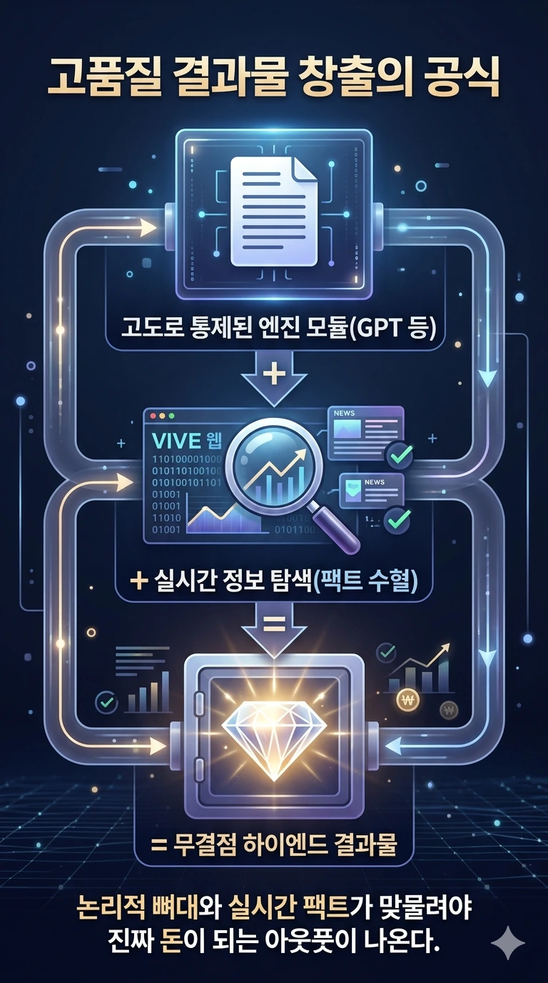 엔진 모듈(GPT 등)과 팩트 탐색(실시간 웹망)이 빈틈없이 맞물려야만 비로소 시장에서 돈이 되는 무결점의 하이엔드 결과물이 탄생한다.