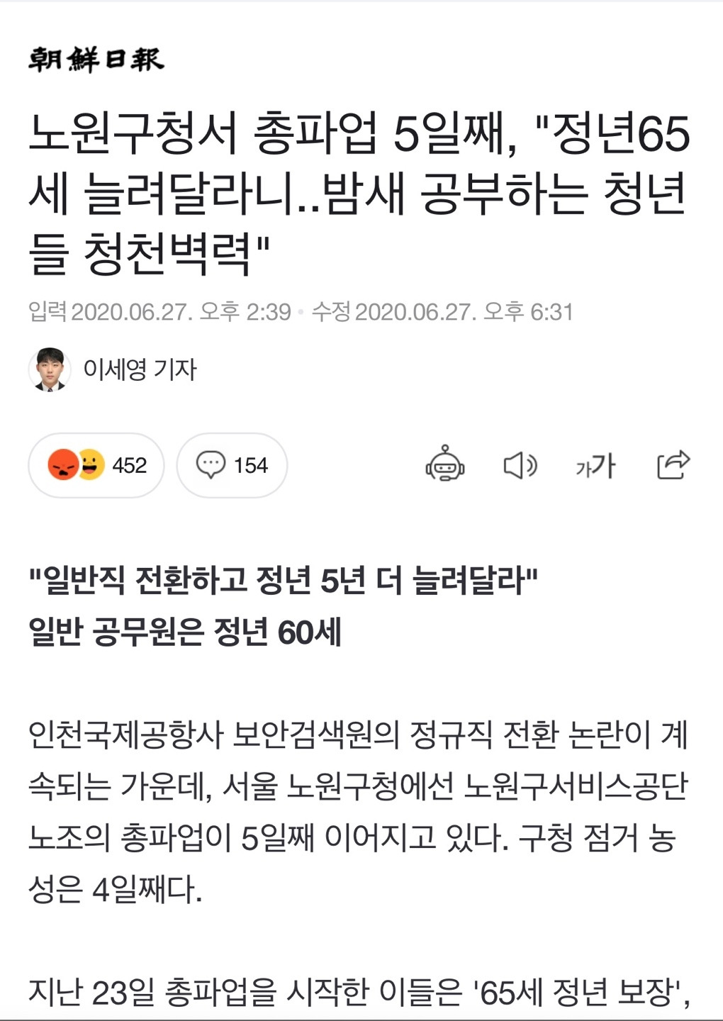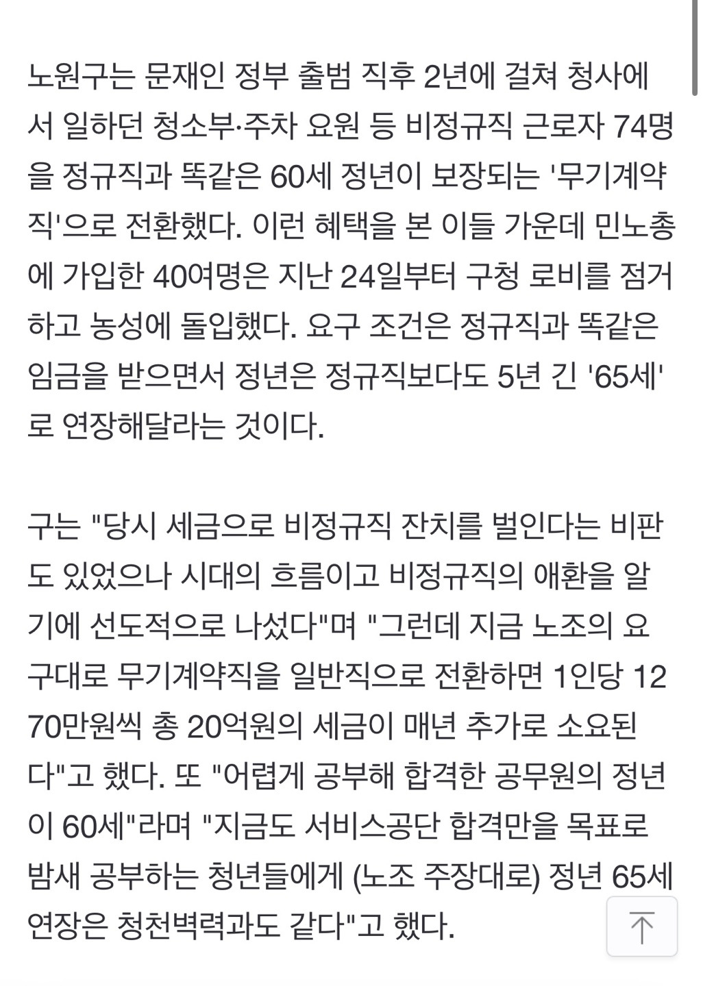 구의 입장에 따라 기사에 나온 대로, 평균 60세를 웃도는 고령 노동자들이 실제로 근무하는데 쓰는 연간 지급액(20억 원)이 없다고 주장하는 반면, ' 정규 공무원들이 일하지 않고 받을 수 있는 돈'은 한 구청에서만 연간 93억 9천6백만 원에 달한다는 계산이 나오게 됩니다. 이는 대충 서울시 전체 자치구(25개)만 따지더라도, 연간 약 2300억 원을 초과하는 세금을 지방직 공무원들의 허위수당을 지급하는 게 쓰이고 있다는 결론이 나오지요. 이미 월급쟁이가 된 정규직 공무원들은 일할 기회조차 없는 고령의 사회적 약자가 받아야 할 급여를 빼앗아 가는 것이 당연하고, 고용의 기회를 조금이라도 더 보장해 달라는 고령 노동자들의 외침의 목소리가 예비 수험생들에게 ‘청천벽력’이라는 말로 위장되어 보도가 되는 것이 현 대한민국의 시국입니다. "사회적 약자의 아픔을 덜어내주어야 할 곳이 지방 구청의 역할일 터인데, 그 아픔을 전혀 진화하고 있지 못하는 것이죠."