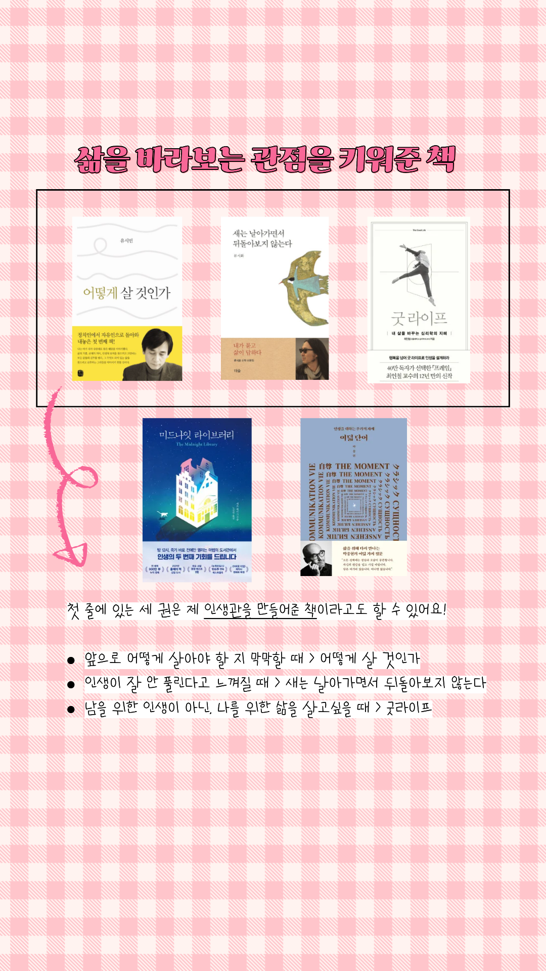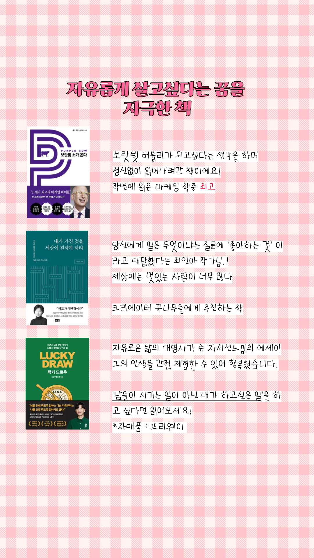 내 마음을 움직인 문장들을 타인에게 공유하고 싶은 마음. 밴쿠버에서 독서인증모임을 운영하게 된 가장 큰 동기이기도 하다. 이처럼, 책 속의 좋은 문장들을 선별하고 거기에 내 시선을 얹어 누군가에게 건네주는 건 내게는 예전부터 익숙한 일이다. 행위 자체로 자유, 의미, 재미 세 가지를 동시에 주니 멈출 이유가 없다. 이 기쁨은 북컨텐츠를 만들 때도 그대로 발현됐다. 외부의 반응과는 관계없이 컨텐츠를 만들고 올리는 자체만으로도 재미있었다.