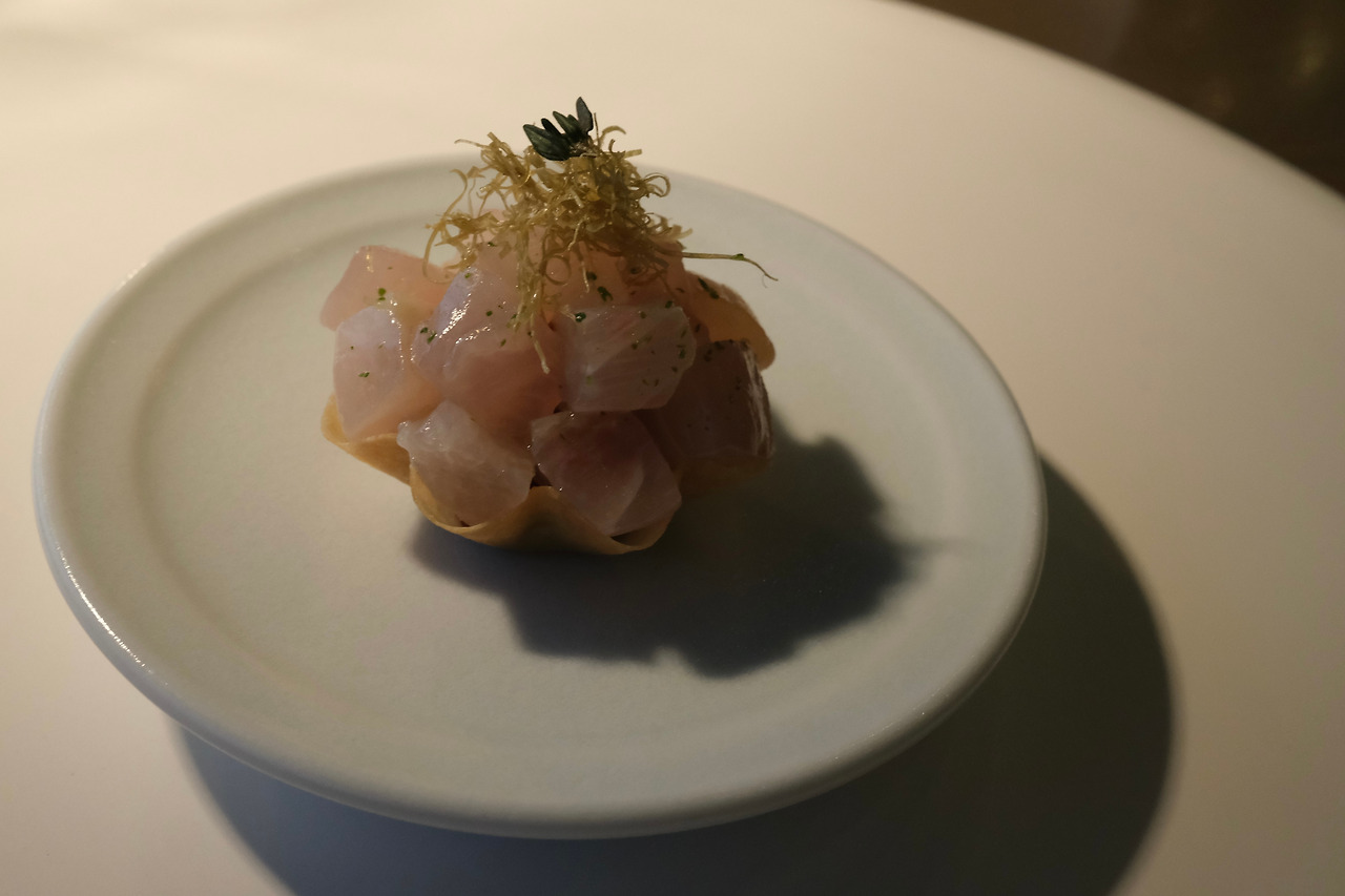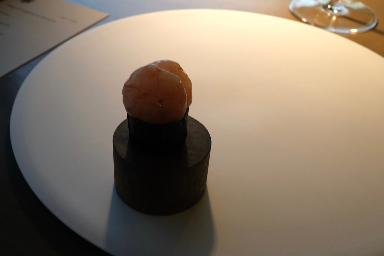 첫 번째 스몰 바이트인 단새우를 올린 김 컵을 입에 넣는 순간, 문자 그대로 ’바삭‘ 소리를 내며 부서지던 김의 식감과 단새우의 부드러움에 놀랐다. 김 컵 안에는 감자 샐러드가 들어있다고 했는데 어떻게 이런 바삭함이 가능한 걸까. 시작부터 놀라운 맛이었다.