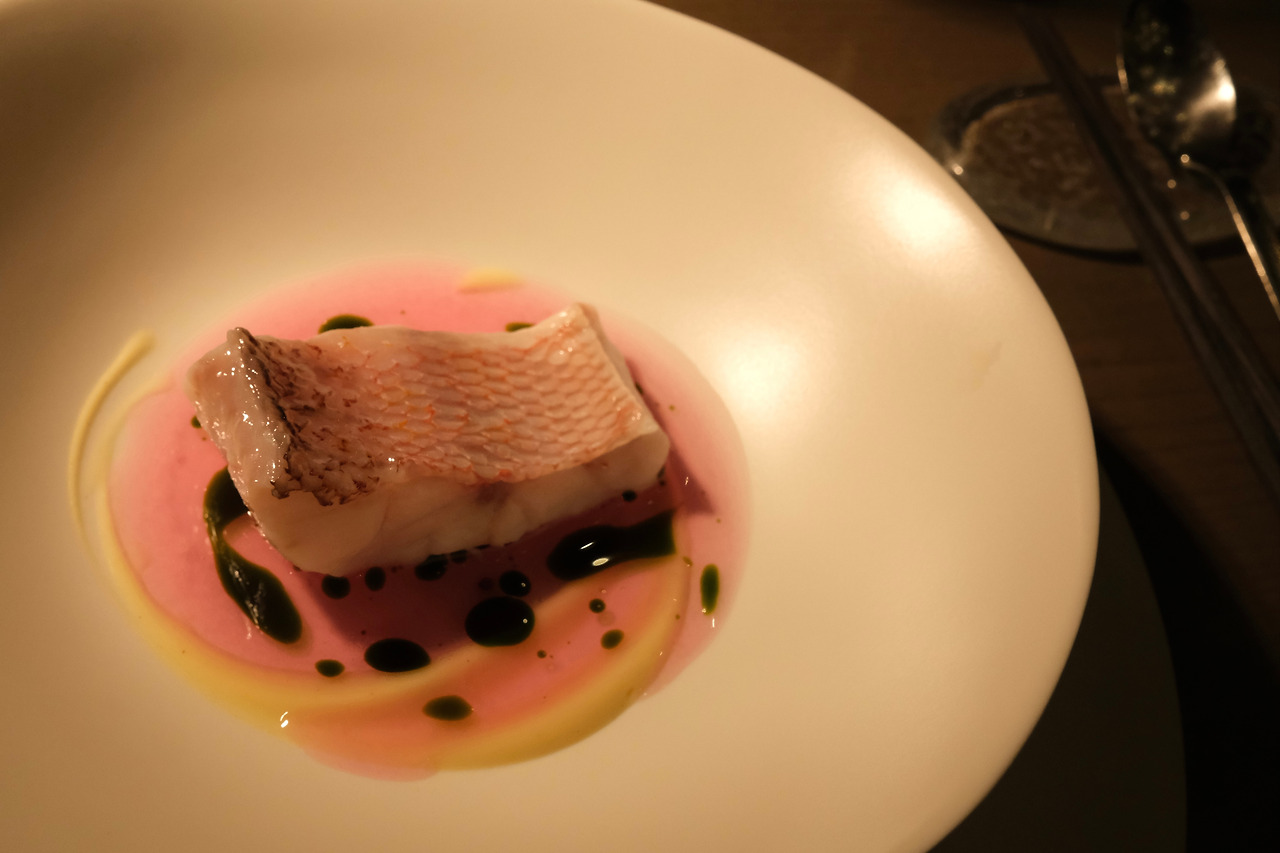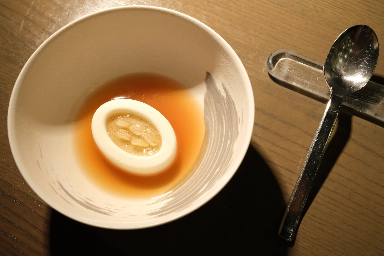 옥돔을 한 입 먹고 나니 그런 생각이 들었다. 내가 먹고 있는 이 음식들은 단순히 맛있는 음식이 아니라, 촘촘하게 짜여진 계획 하에 순전히 셰프의 의도대로 만들어진 영리한 결과물이구나. 옥돔의 부드러운 생선살 외의 불순한 것들은 모두 제거된 느낌이었다. 생각해 보니 이제껏 먹었던 모든 음식이 그랬다. 입 안에 들어갔을 때 불쾌한 감각을 줄 수 있는 것은 모두 제거된 상태였다. 어떤 재료에서 원하는 포인트가 있으면 그것은 최대한 살리고 나머지는 모두 아웃시킬 수 있는 능력, 역시 안성재. 우리나라에 이런 셰프가 있다는 게 갑자기 자랑스러워 동네방네 떠들고 싶은 마음이 들었다. 우리는 안성재 보유국! 국뽕이 차올랐다.