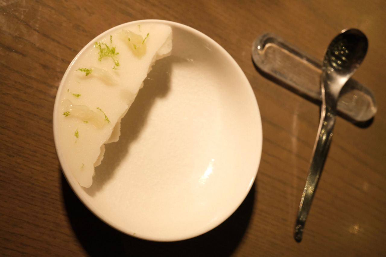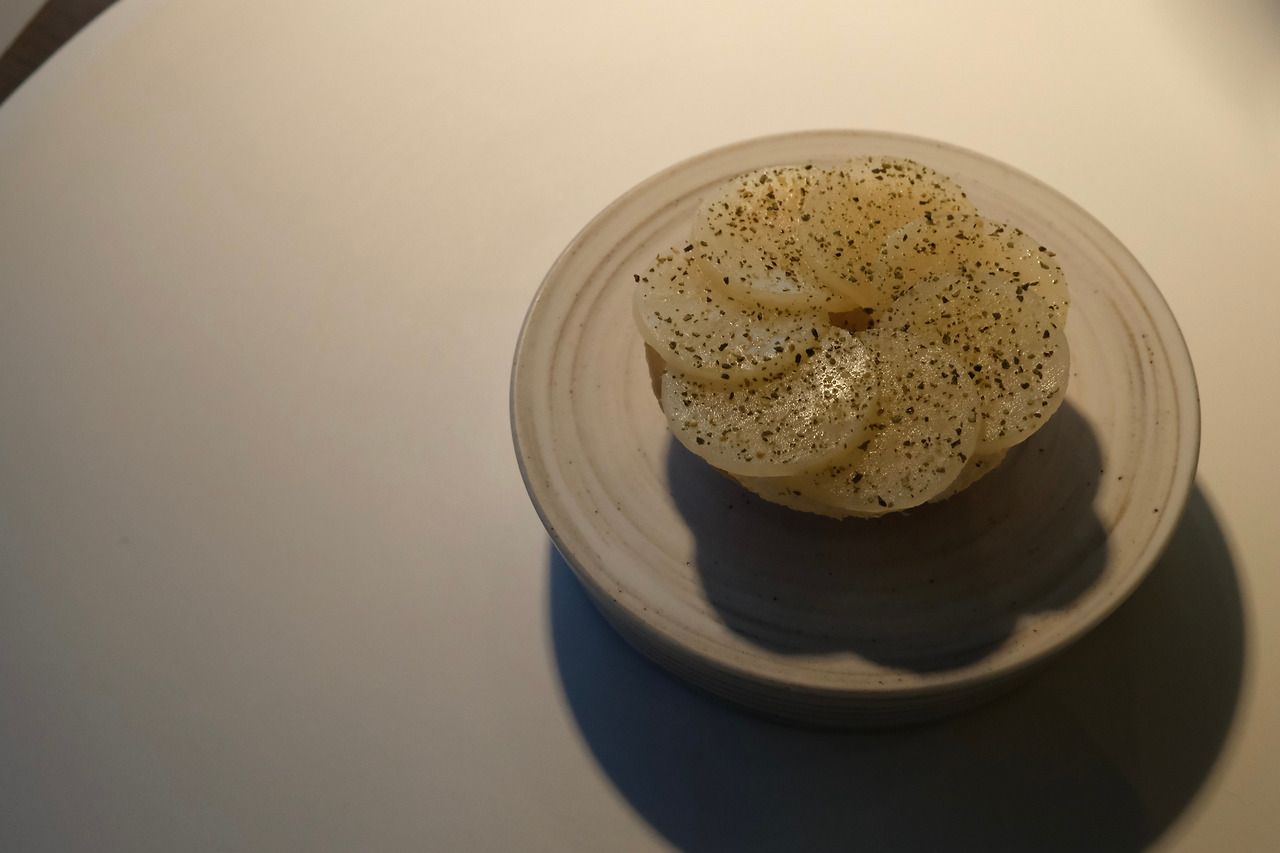 두 번째는 콜라비 타르트. 모수에서 쓰는 콜라비는 내가 아는 콜라비와 다른 건가 싶은 생각이 들었다. 바삭하게 부서지던 얇은 타르트지와 콜라비의 조화가 너무 아름다워서 웃음이 났다.