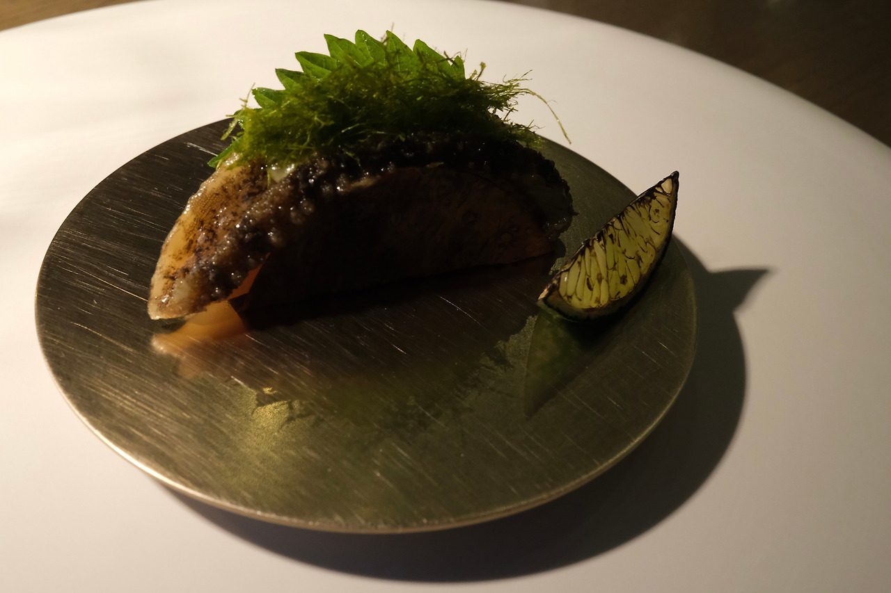 마지막 스몰 바이트는 모수의 시그니처인 전복 타코. 해산물 쪼렙인 나는 질긴 식감 때문에 전복 역시 그다지 선호하지 않는 편인데, 모수의 전복 타코는 내가 알던 전복이 아니었다. 한 입에 넣을 수 없는 크기라서 반을 깨물었더니 유바의 바삭한 식감과 함께 부드럽게 잘리던 전복. 입안 가득 채운 전복의 맛, 그 식감. 잊을 수가 없네.