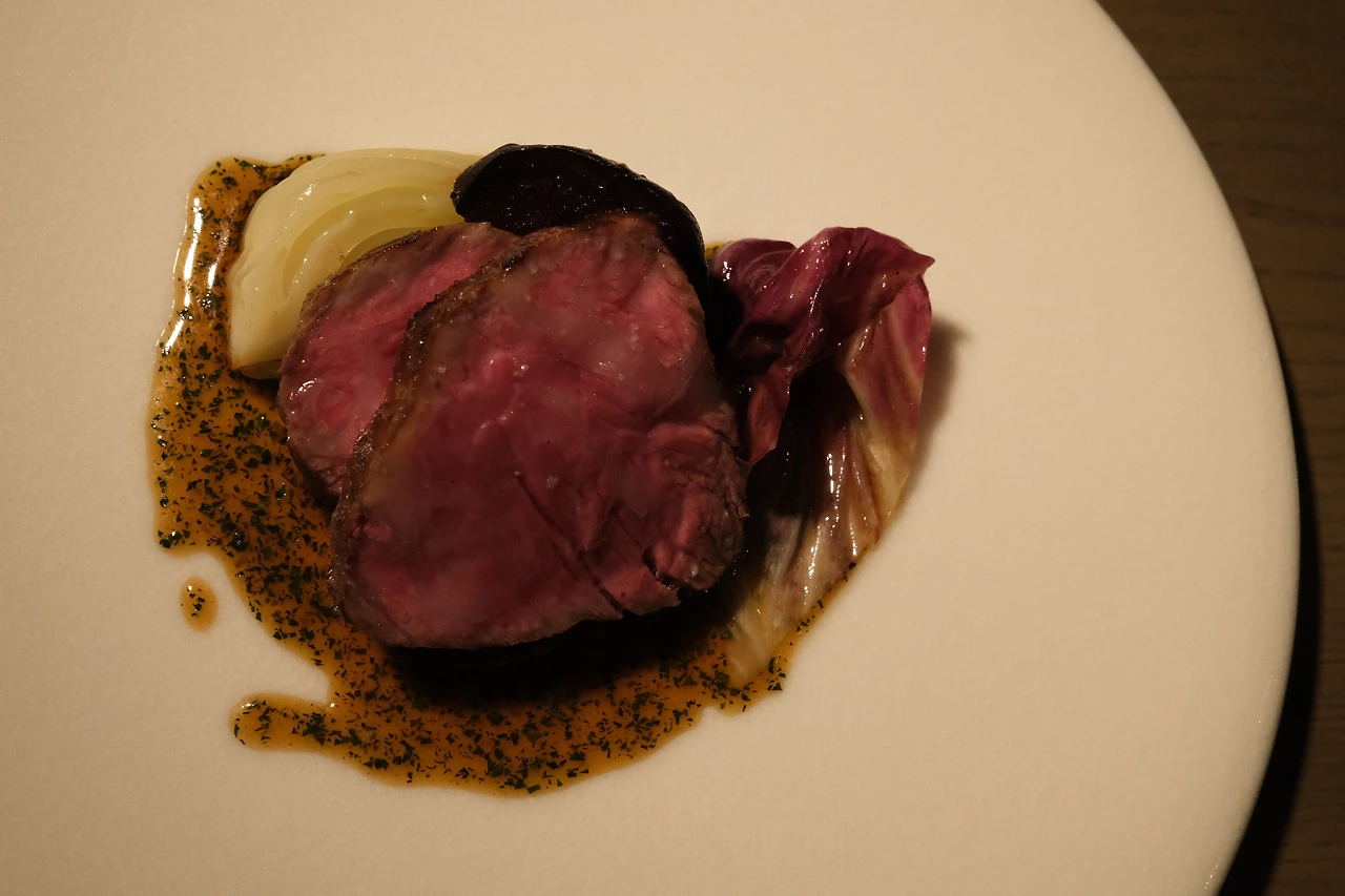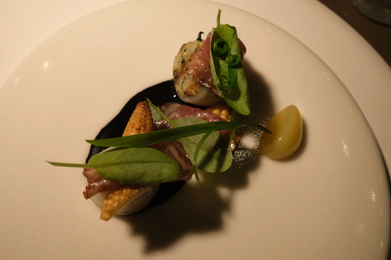 귀여운 오징어 순대, 애기 오징어로 만들었다는데 오밀조밀 조합이 너무 앙증맞았다. 남편과 연애하던 시절에 속초에서 먹어 본 오징어 순대를 떠올리며 입에 넣었는데, 달라도 너무 다른 맛. 이제껏 어디서도 볼 수 없던 맛. 순대가 이렇게 야들야들 부드러우면 이거 반칙 아니냐고요. 부드러운 순대의 식감을 보완해 주는 한우로 만든 햄과 애기 옥수수까지. 완벽하게 조화로운 요리였다. 남편이 유튜브에서 홍석천이 소스를 핥았다는 이야기를 해주었는데 그 마음이 뭔지 충분히 이해가 됐을 정도로 소스까지 완벽하게 아름다웠다.