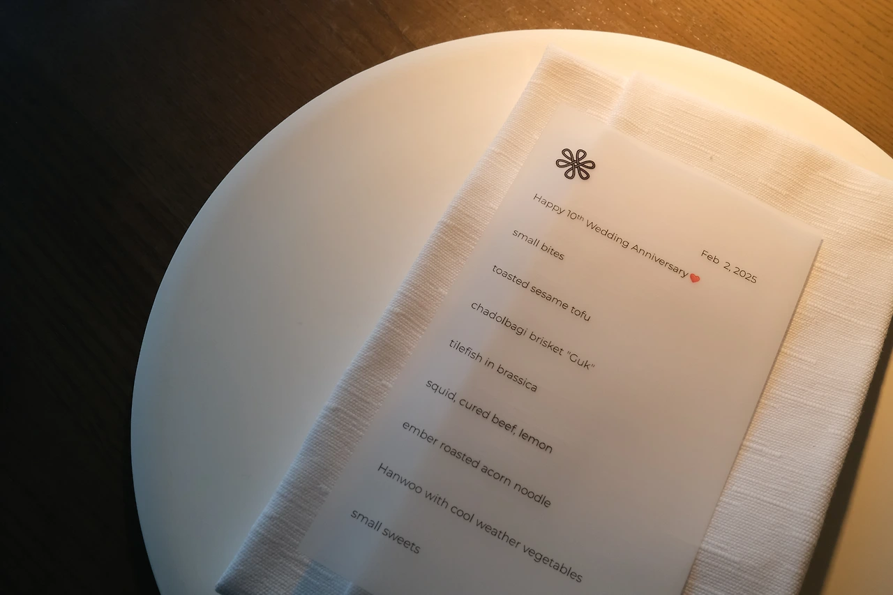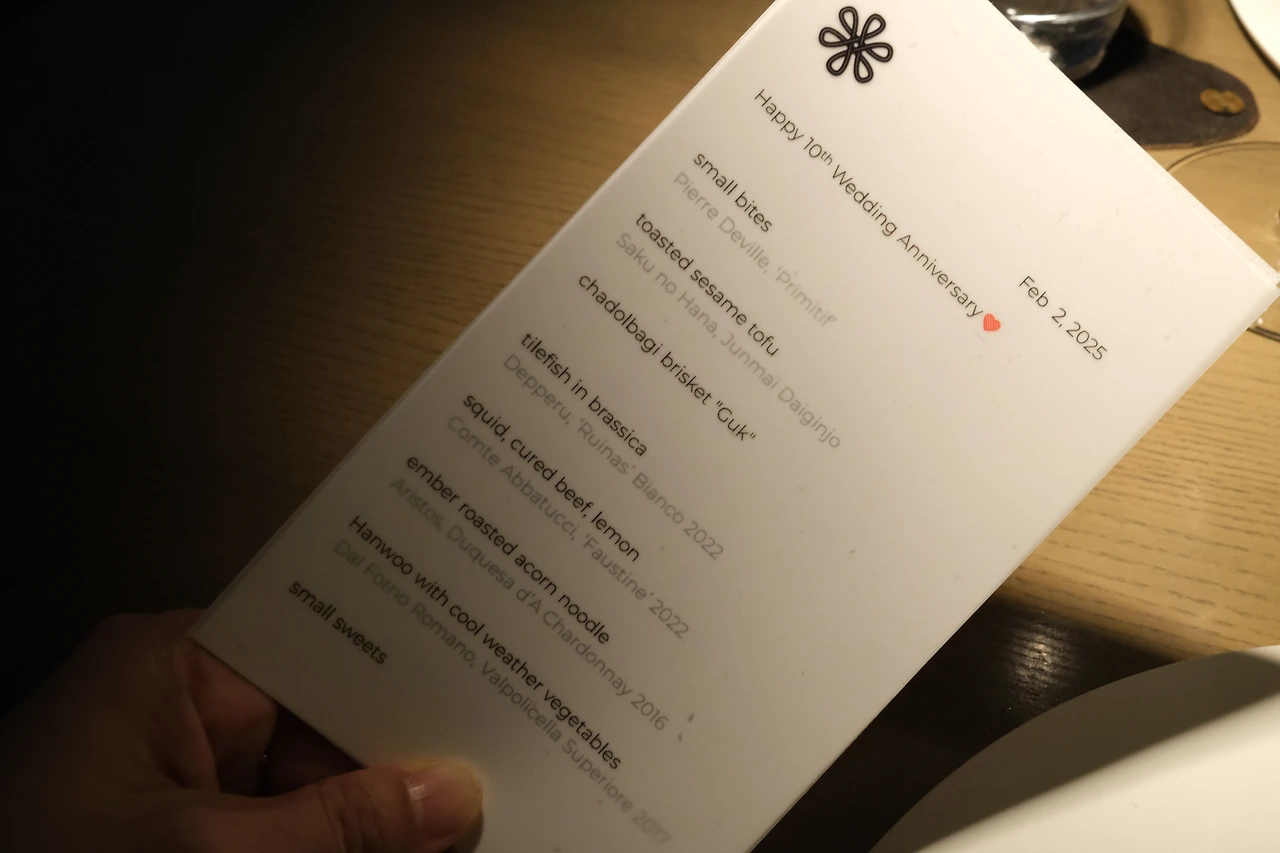 예약일로부터 석 달 뒤, 우리는 홍콩에 왔다. 홍콩 모수가 위치한 M+ 건물은 굉장히 한적한 곳에 위치한 모던한 건물이었다. 6시로 예약을 한 덕분에 조용히, 창가 자리에 앉아 식사를 할 수 있었다. 자리에 앉아 준비된 메뉴를 보니 ‘Happy 10th Wedding Anniversary’가 나를 반겼다. 결혼기념일은 아직 석 달이나 남았지만 올해가 10주년인 건 맞으니까, 남편이 귀여워서 웃음이 났다.