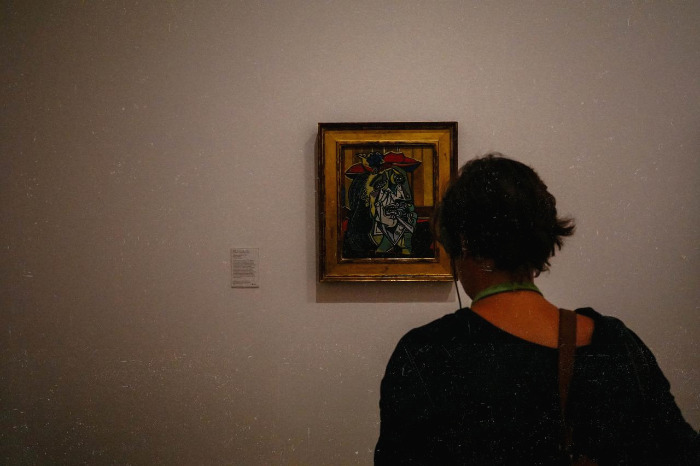 "피카소의 우는 여인이라는 작품이야. 그림 속 여자의 얼굴이 조각나 있지? 저렇게 대상을 파편화 함으로써 입체적으로 표현한 거야. 저 시기에 그린 피카소의 그림을 보면 얼굴은 정면인데 코는 측면의 모습을 하고 있는 등의 시점이 다른 것을 볼 수 있어. 평면인 그림에 시간 개념과 공간 개념을 넣은 거지."