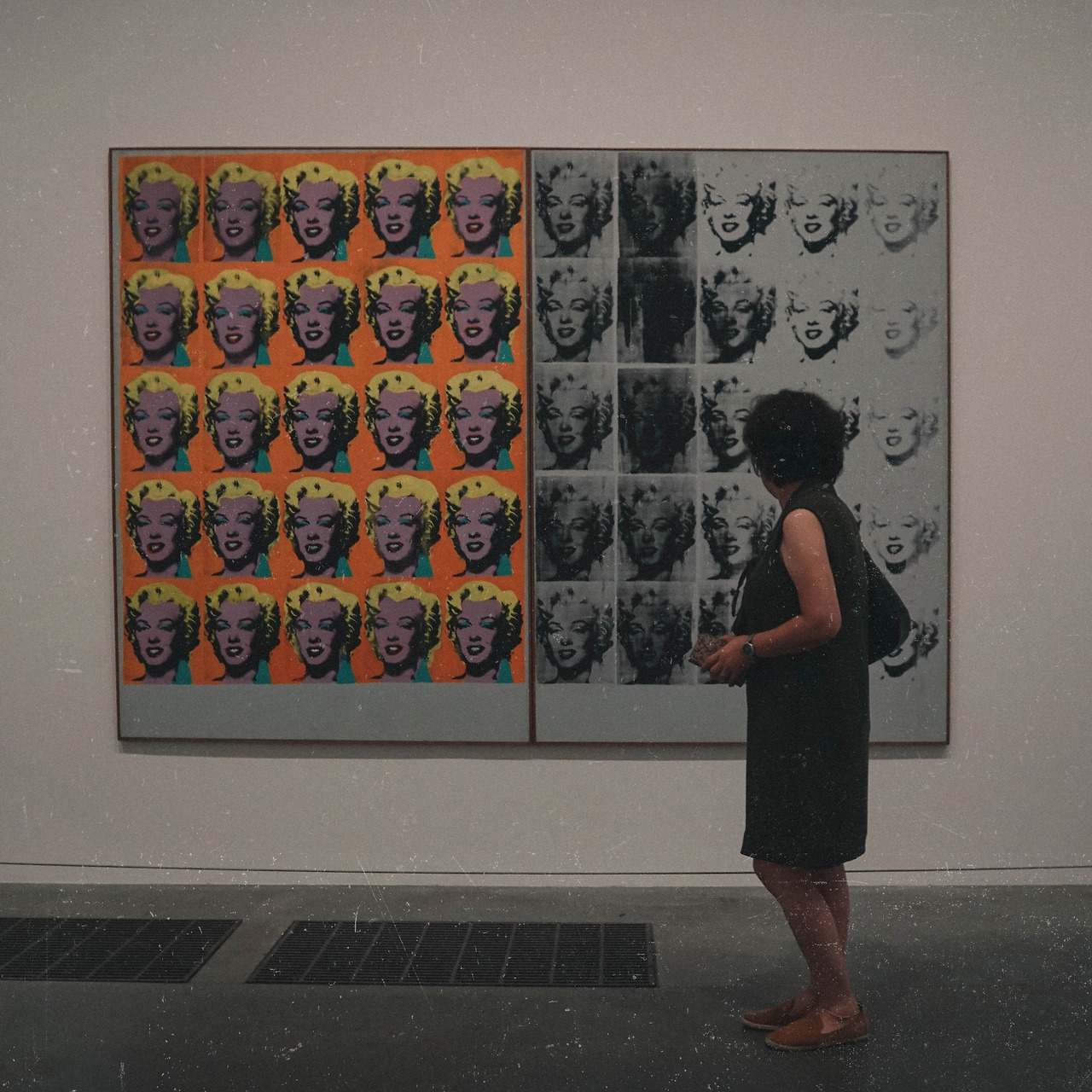 "너무나도 유명한 앤디 워홀이야. 그림이 마를린 먼로잖아. 작가가 대중적인 아이콘을 미술에 가져온 거야. 앤디 워홀뿐만 아니라 많은 유명인사, 그리고 코카콜라까지. 다 찍어내. 그림을 더 이상 손으로 정성스럽게 그리는 것이 아닌 기계로 찍어내는 거야. 엄마가 알던 미술과는 다르지?"