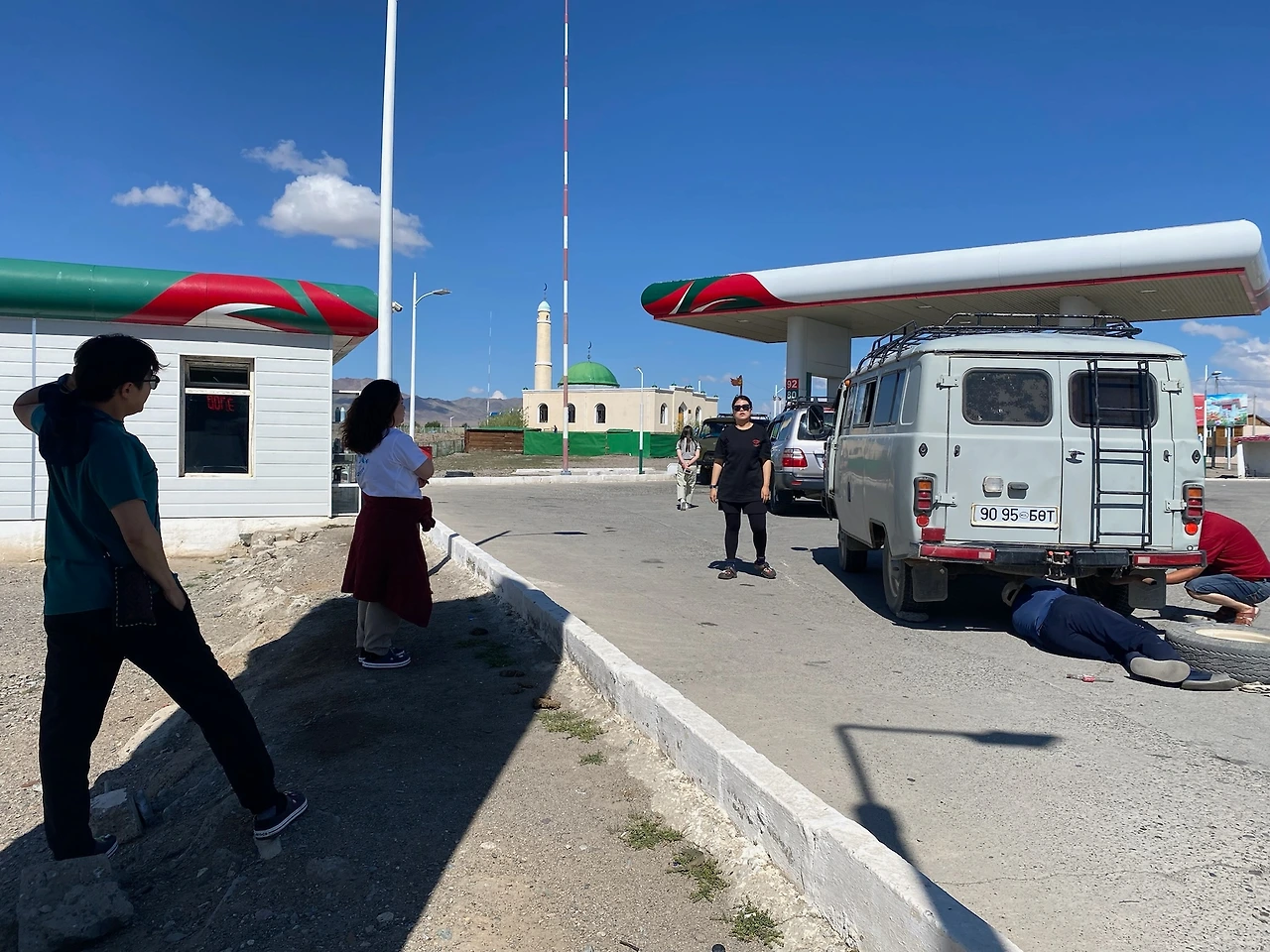 여행 시이작! 도심을 나가기 전에 푸르공에 기름을 가득 채워야 하는데, 줄지어 서 있는 차들이 가득이다! 기다리기 심심하니 주유소 옆에 있는 이슬람 사원엘 들어가봤다.