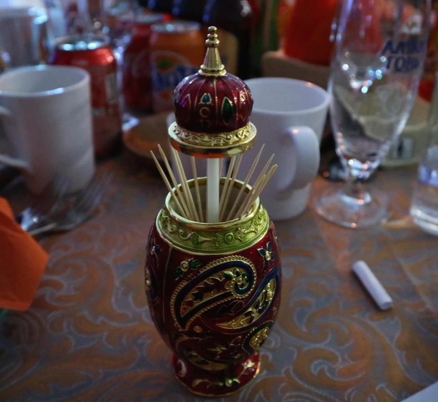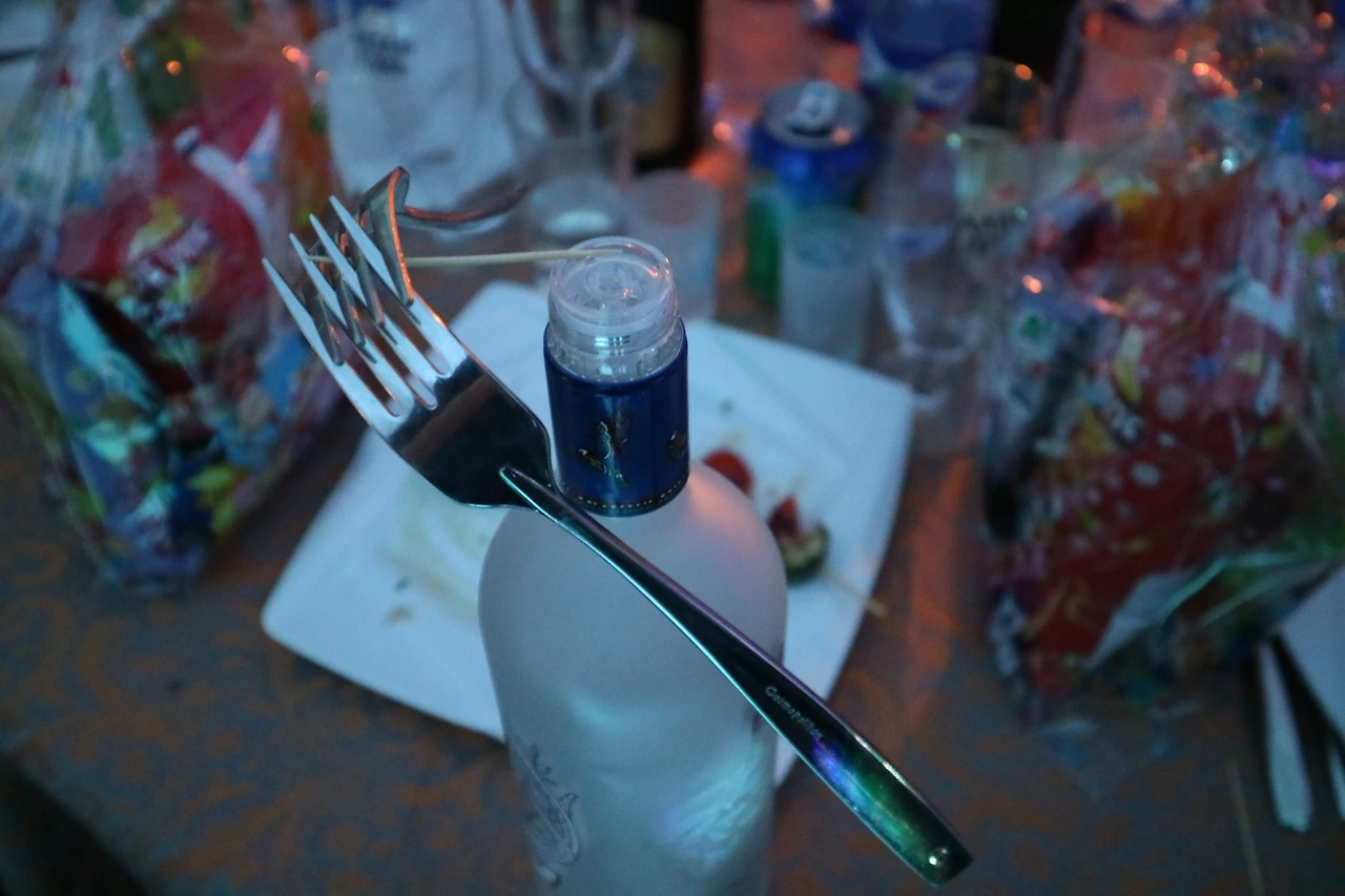 귀여운 빨간색 보타이를 맨 시장은 내가 이쑤시개 통을 보고서 신기해하니까 더 신기한 게 있다며 포크 두 개를 겹쳐놓고 사이에 이쑤시개를 꽂아서 저렇게 보드카 병 위에 올려놓았다.