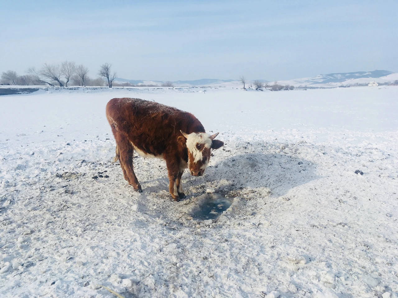 그렇다. 여기는 진짜 강위다. 주인이 도끼로 얼음을 깨서 가축들에게 물을 먹이고 있었다.