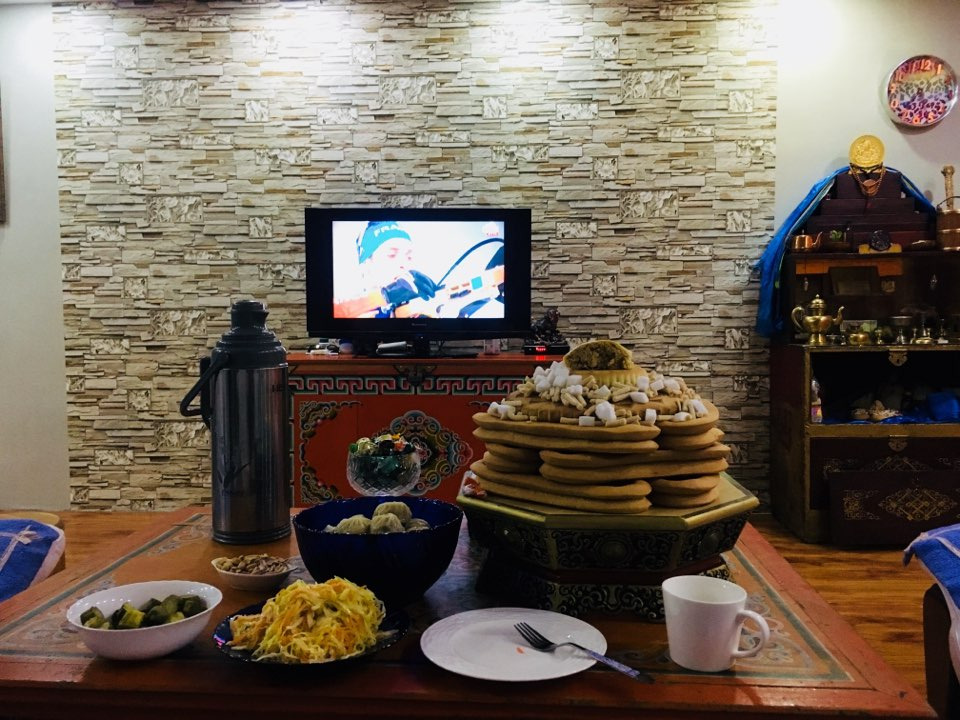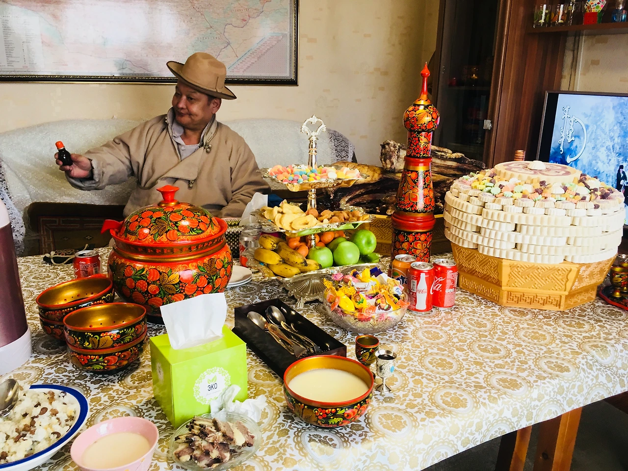 어느 집에 가나 시장에서 봤던 그 고기들과 커다란 아롤, 온갖 술, 그리고 사탕과 쪼꼬렛과 같은 주전부리들이 한상 가득 놓여 있다. 그리고 빠질 수 없는 몽골식 찐만두 보쯔...
