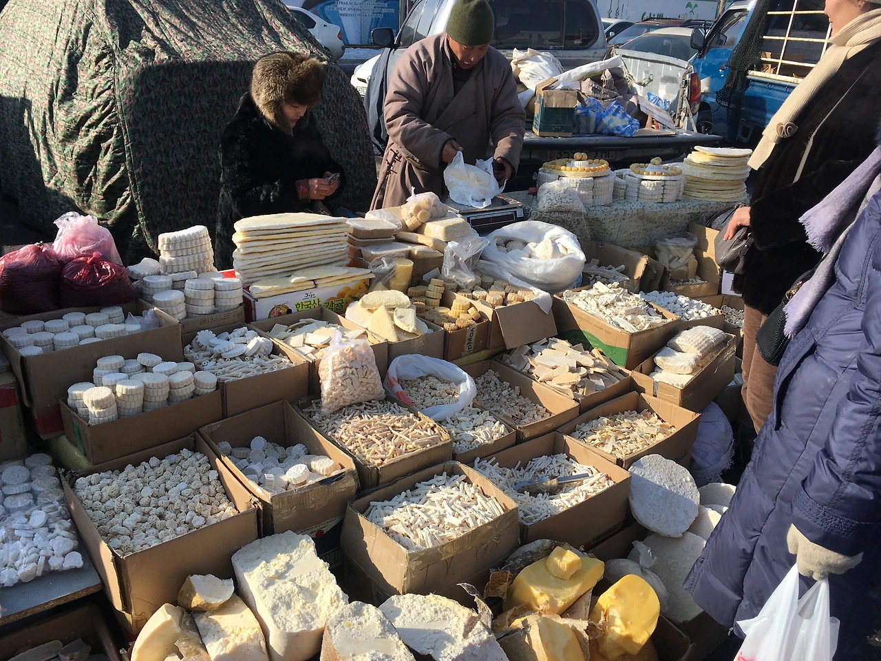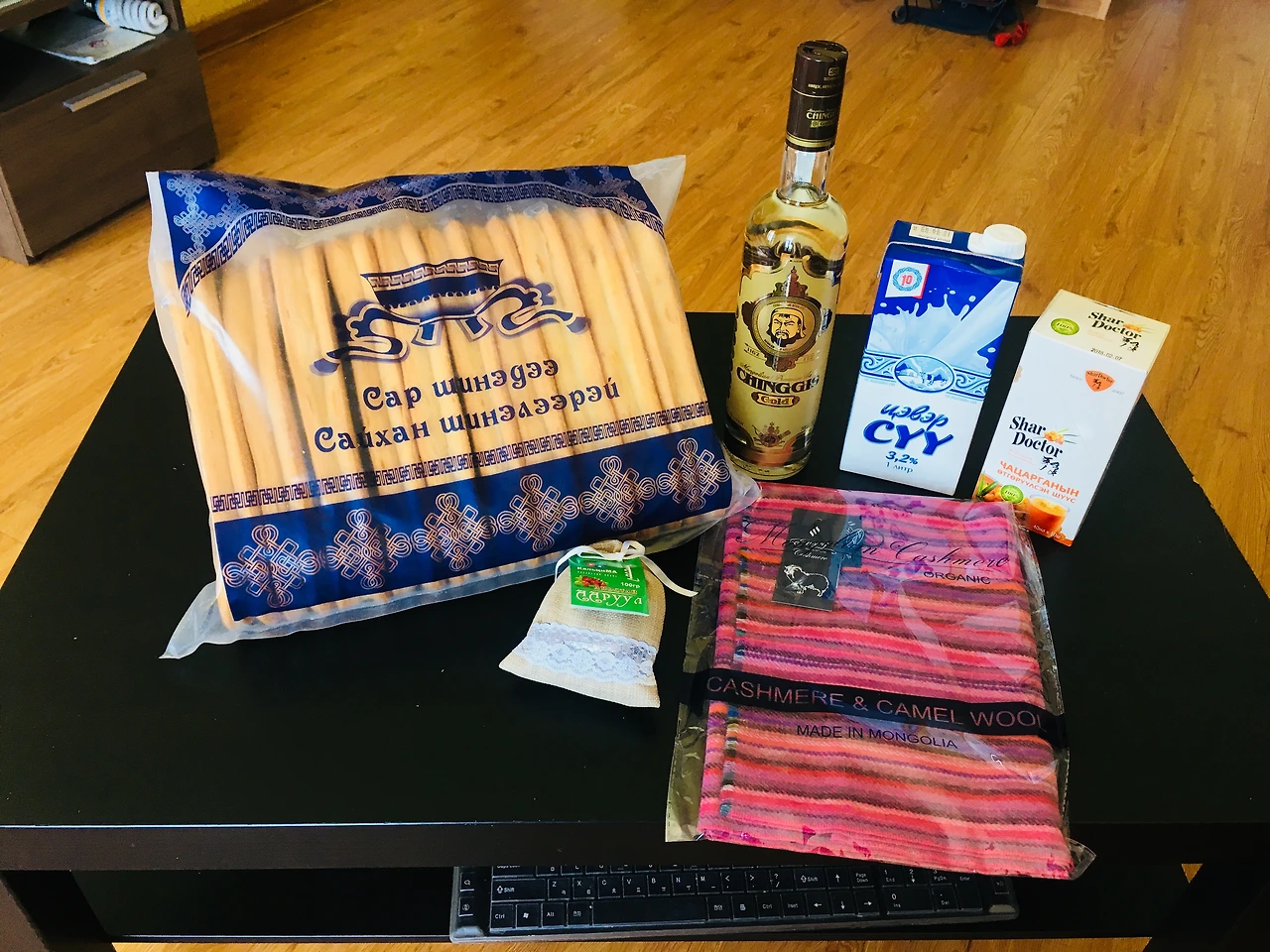 명절상에 올리는 빵과 칭기스 보드카, 우유, 차차르강 비타민, 캐시미어 목도리, 아롤-