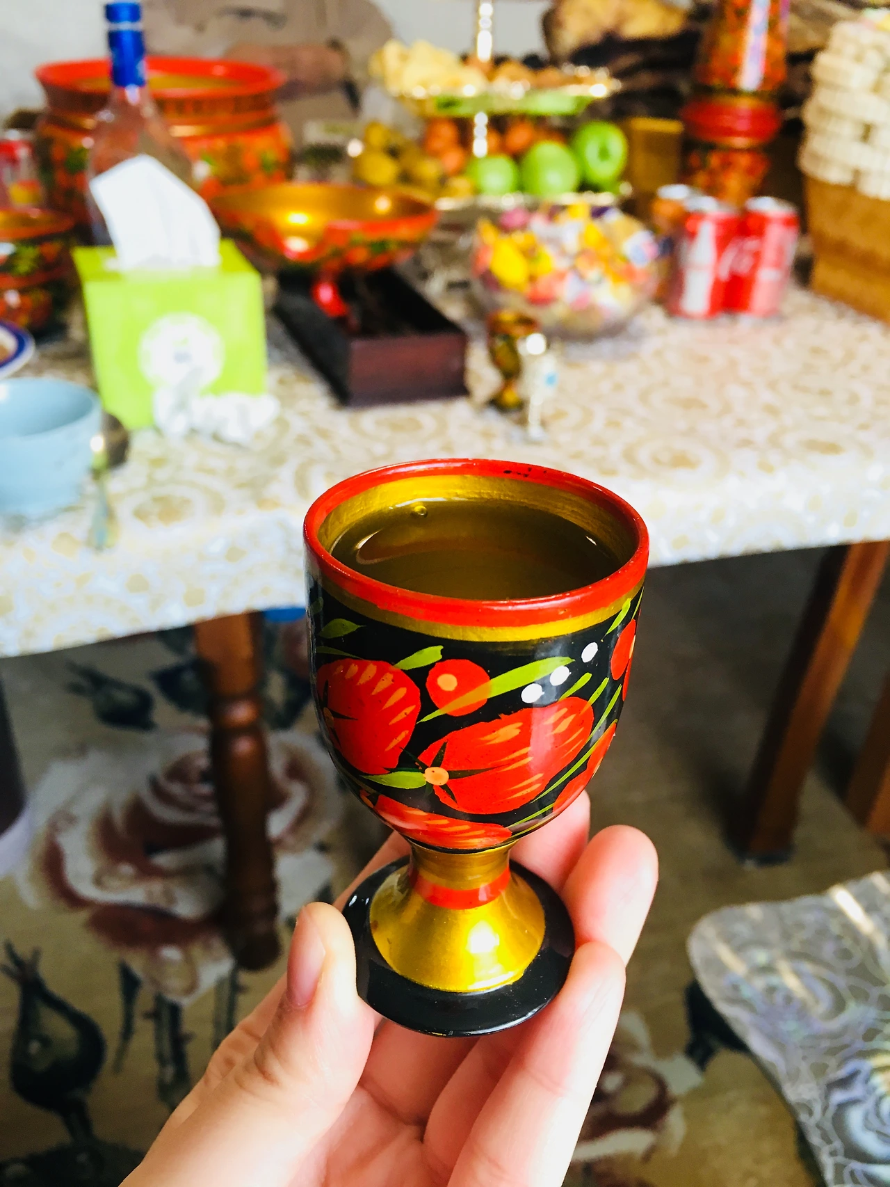 러시아에서 사 왔다는 이쁜 나무 잔에 보드카랑 위스키를 반반 섞은 술도 한잔 받아서 마시고, 보쯔도 먹었다.