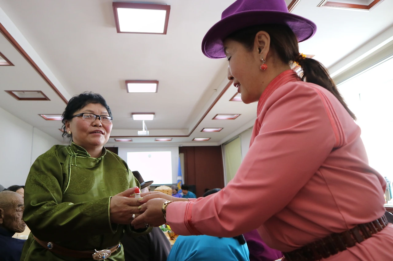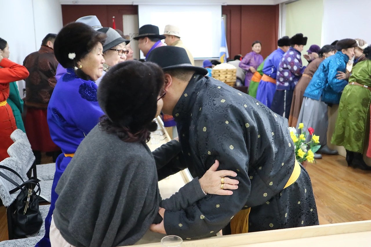 몽골식 세배는 가장 연장자가 앉아있으면 어린 나이 순으로 연장자에게 볼뽀뽀를 하면서
