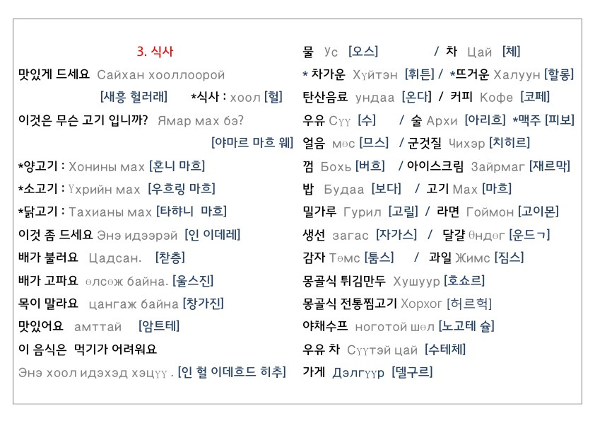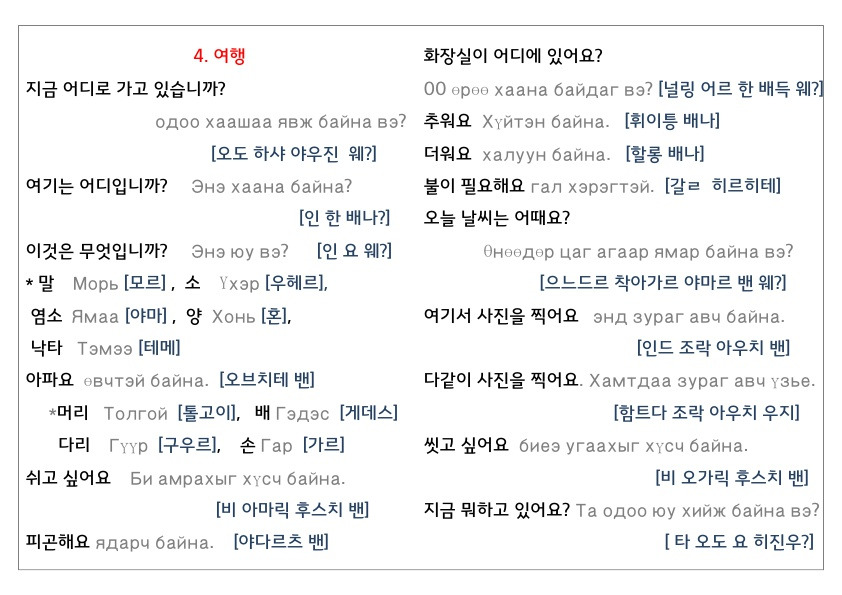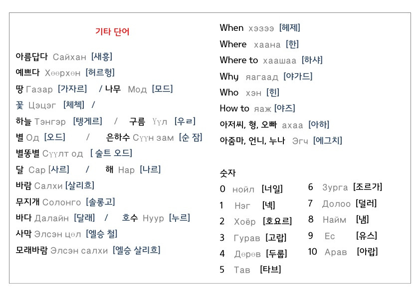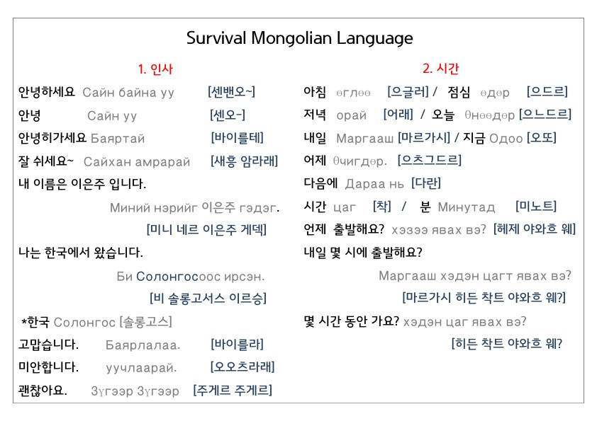 한국어를 모르는 현지인과 여행을 가기 때문에, 혹시 모를 상황에 대비해 가장 필요할 것들만 두서없이 정리하면서 브런치에도 올려본다. 사실 몽골어는 발음만 잘 익히고 기본만 배우면 어느 정도 의사소통이 가능하다.