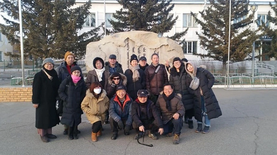 본죽에서 나와 투브아이막 광장을 한번 둘러보고 다들 찍고 가는 저 돌 앞에서 단체사진!