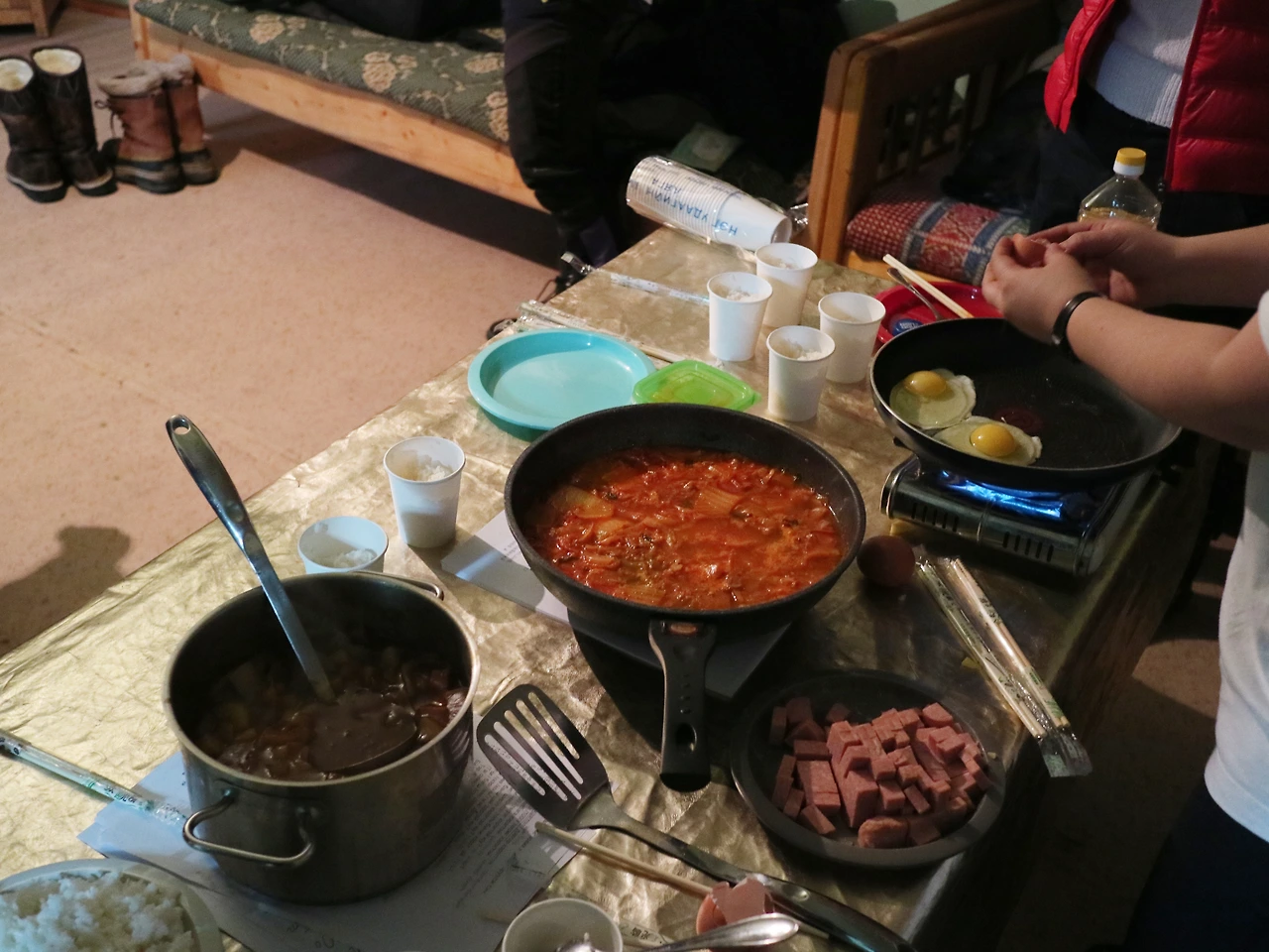 여건이 되는대로 열정적으로 요리를 해야 한다!! 그래서 둘째 날 저녁은 김치찌개에 카레, 그리고 햄 달걀 볶음- 한 명 한 명 각 요리에 달려들어 밥을 해동하고 감자와 양파를 썰면서 후다닥 요리를 완성했다. 진심 저 김치찌개 너무너무 맛있었다!! 집에서 먹으면 이 맛이 안 나겠지..